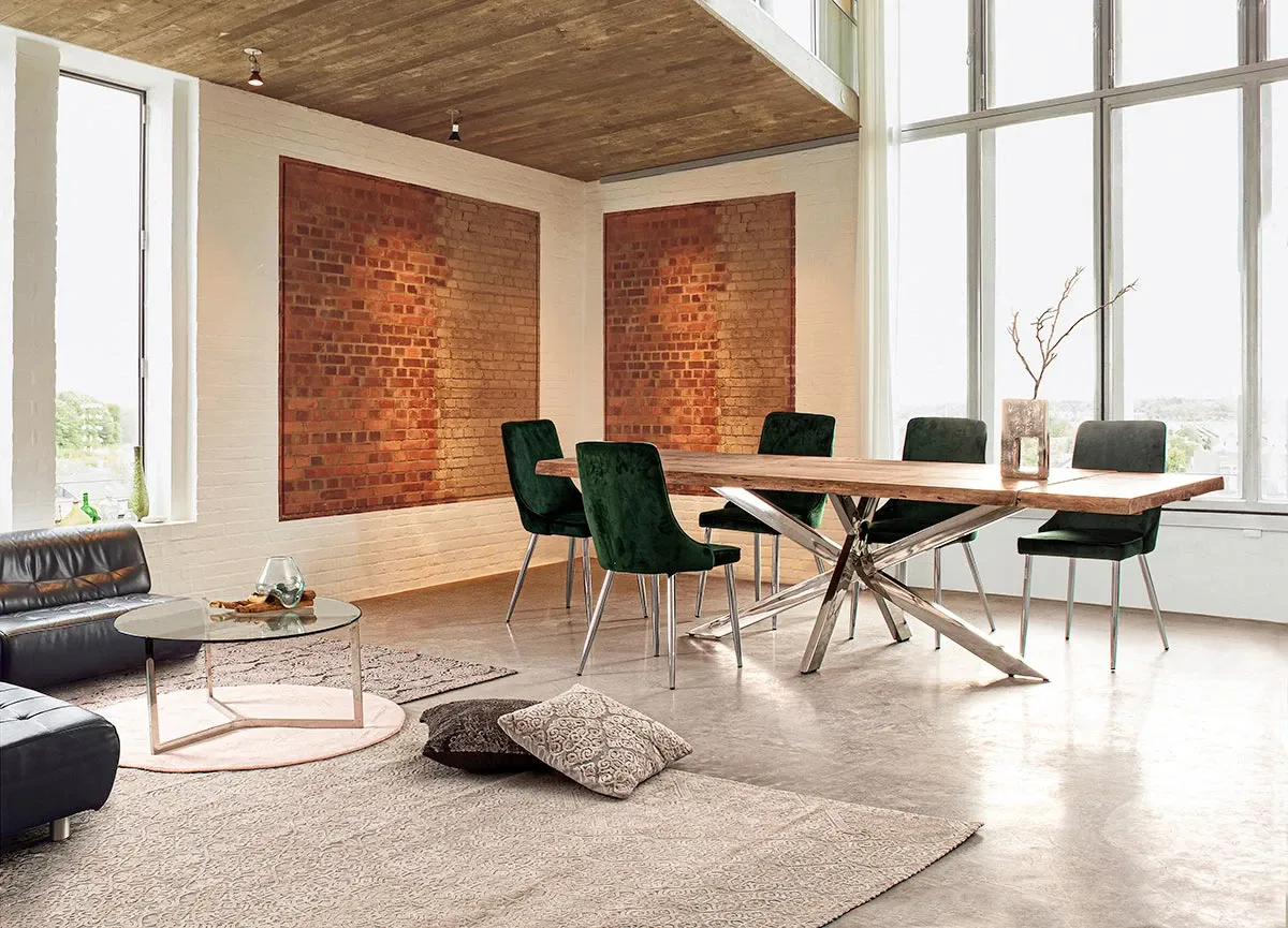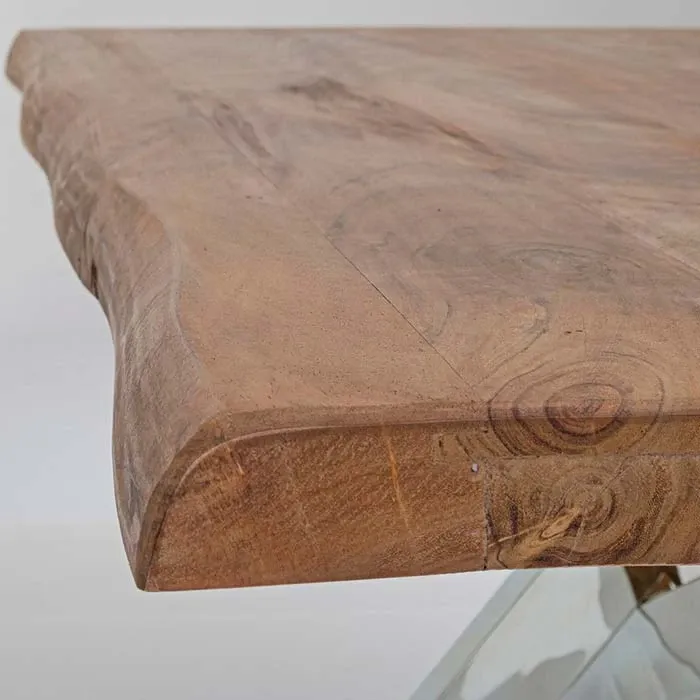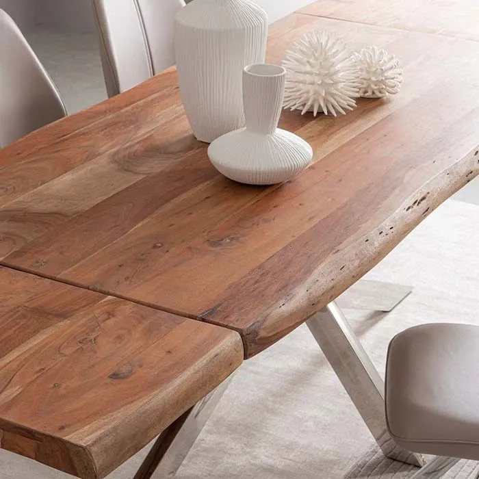 l tavolo Arkansas: piano in autentico legno d acacia ricavato da sezioni di tronco con finitura acrilica protettiva e gambe in acciaio inox, completo di due prolunghe esterne da 40 cm. Essendo lavorato a mano ogni tavolo è unico nelle forme