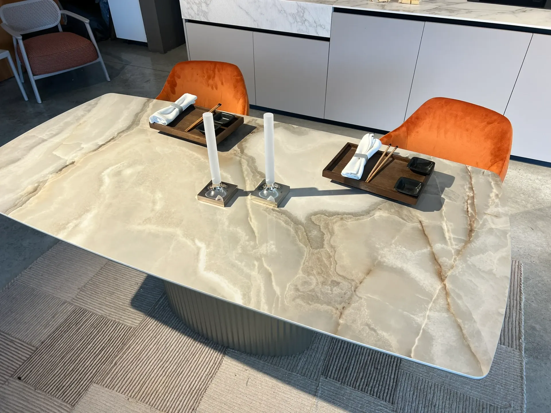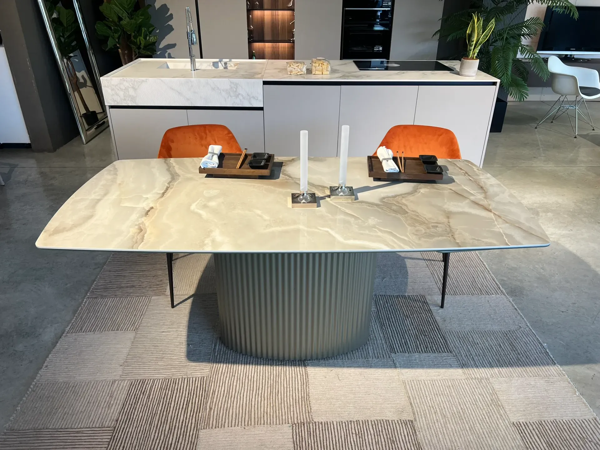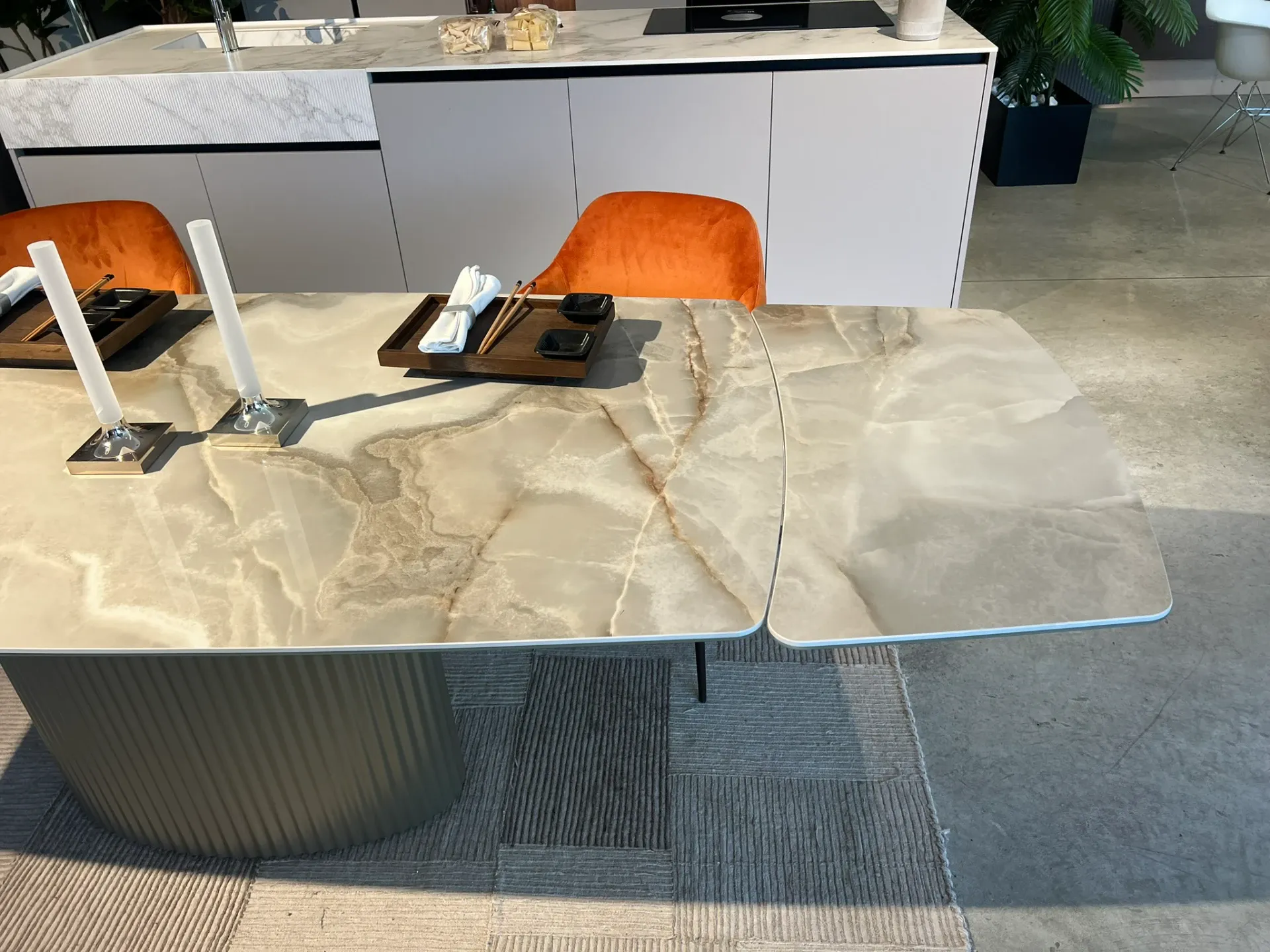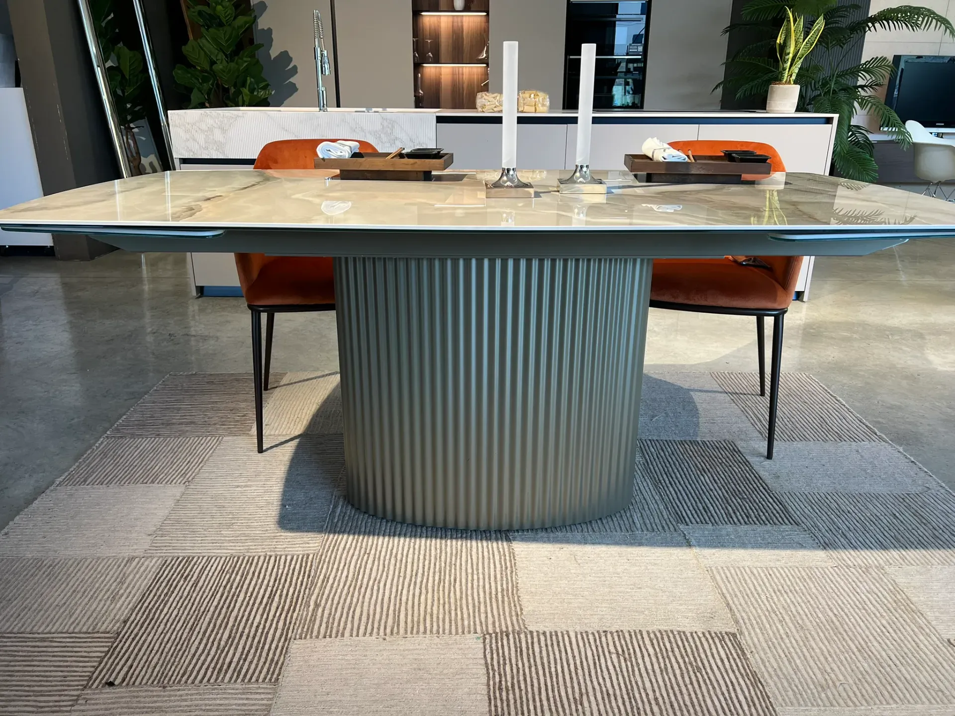 L'uso della ceramica per le allunghe garantisce continuità nel design e nella qualità dei materiali. Questo dettaglio assicura che il tavolo mantenga la sua bellezza e funzionalità anche quando esteso alla massima lunghezza. Il Riflessi Enea è ideale per chi cerca un arredo versatile senza rinunciare allo stile.