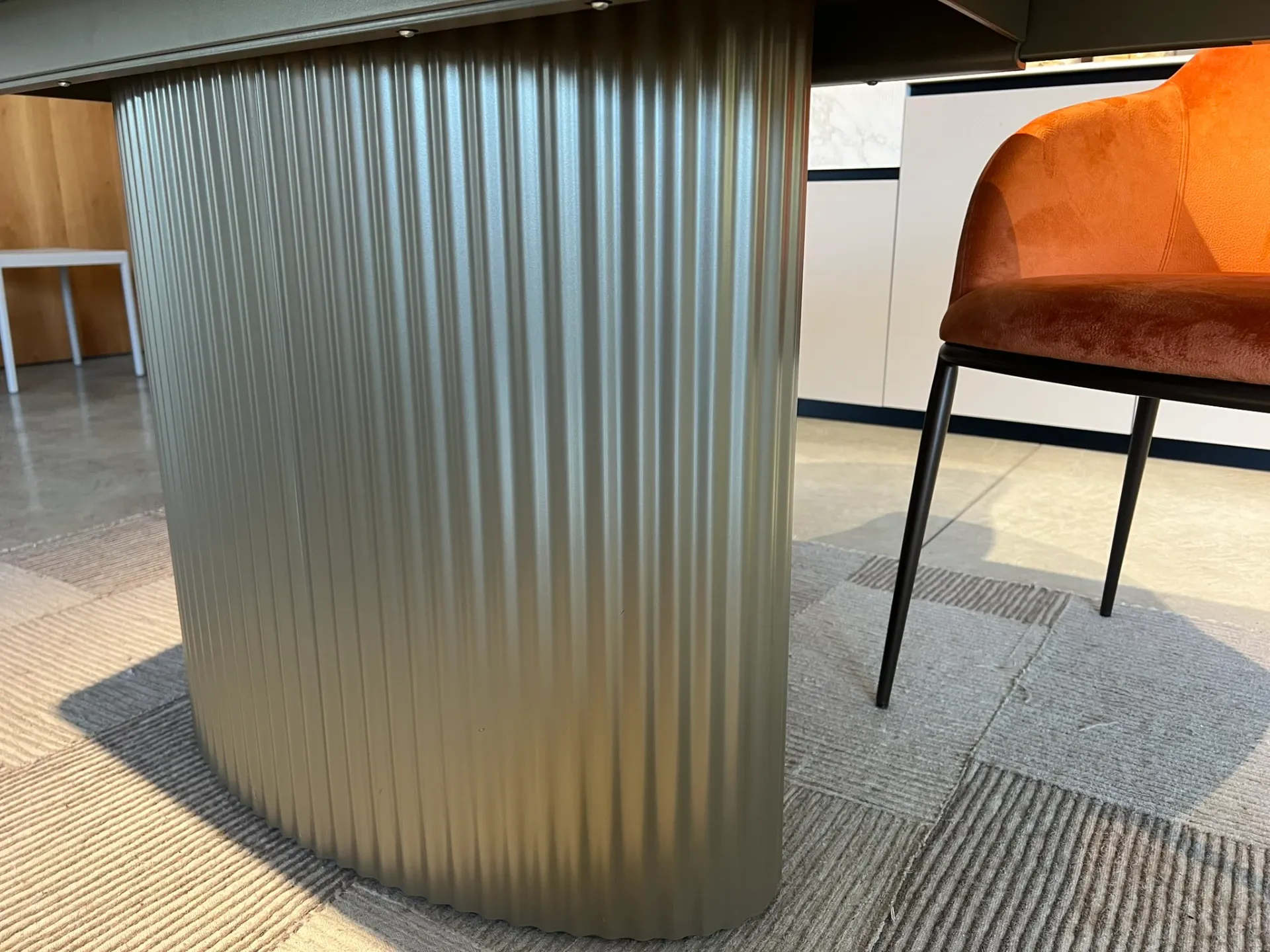 La gamba unica champagne, con il suo effetto dogato, aggiunge un tocco di modernità e stile al design complessivo. Questa scelta stilistica non solo conferisce stabilità al tavolo, ma lo rende anche un elemento centrale in qualsiasi ambiente, dal soggiorno alla sala da pranzo. La finitura champagne delle gambe si abbina perfettamente al top, creando un'armonia visiva che arricchisce l'estetica dello spazio.