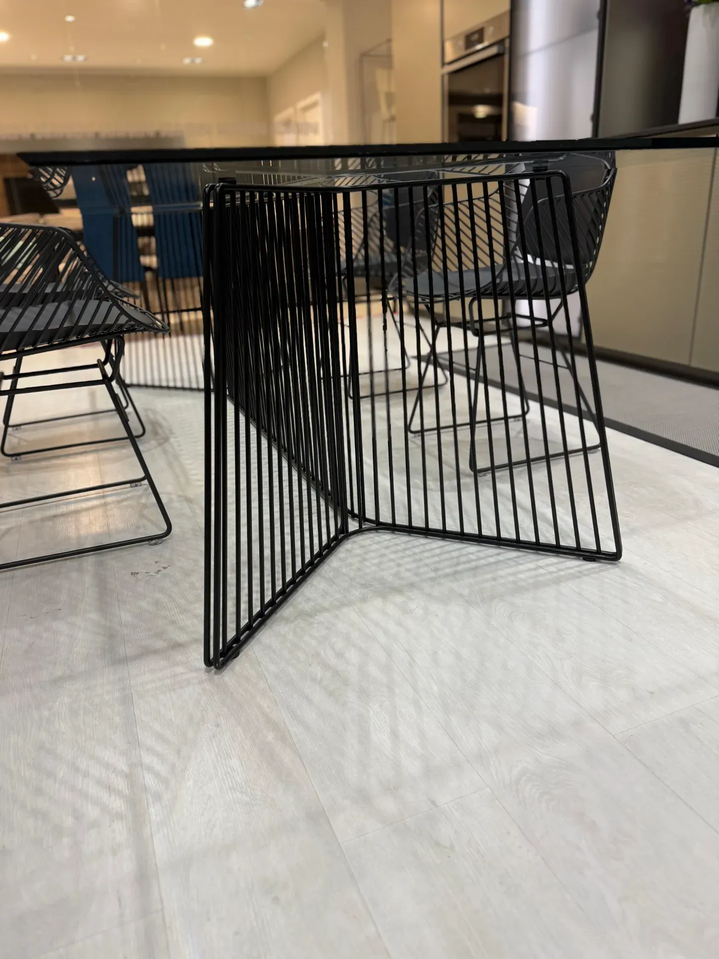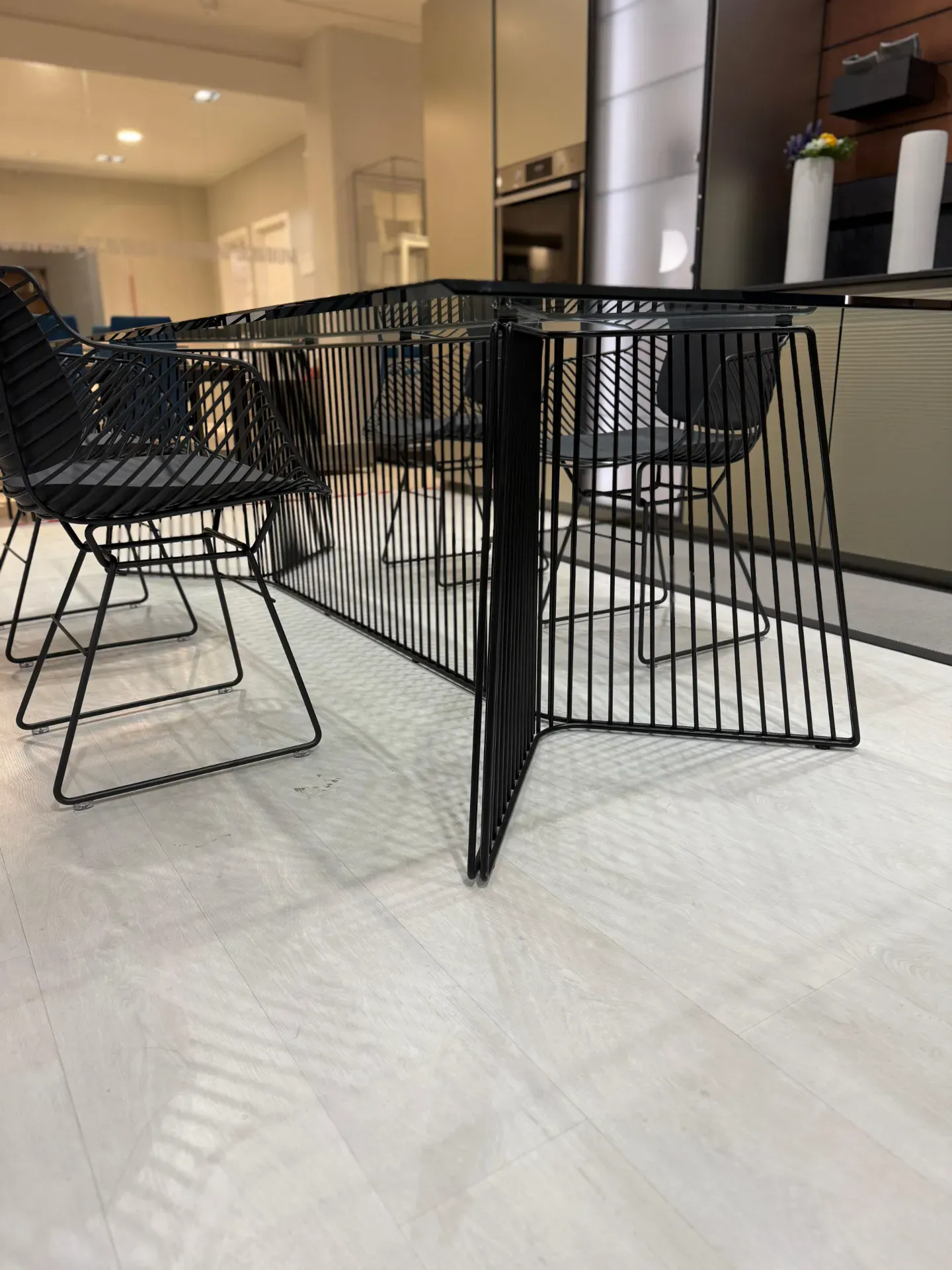 La base è realizzata in tubi d acciaio verniciato nero, disposti in una sequenza che crea un effetto di leggerezza visiva e semitrasparenza.