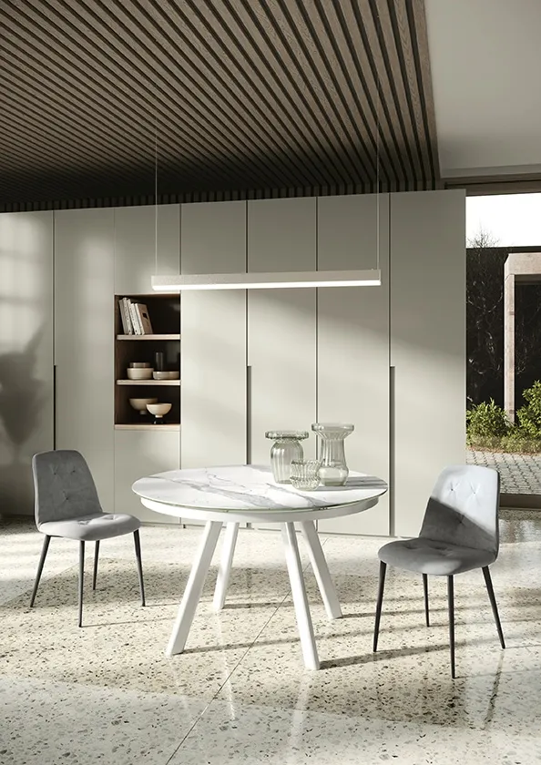 I locali interni devono essere conformi alle richieste di chi li vive e gli arredi non devono mai essere d'ingombro, per questo motivo è fondamentale selezionarli anche in base alle loro dimensioni; il tavolo Rotondo allungabile Ingenia qui visibile va da 101 a 130 cm in lunghezza, risultando così ideale per un interno di diverse dimensioni.