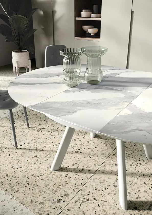 Quando si apre la prolunga, il tavolo passa da Ø 125 cm a una forma ovale da 175x125 cm e qui entra in gioco la scelta di stile più interessante di questa versione: le prolunghe in legno laccato bianco opaco creano un contrasto deliberato con il piano in supermarmo. Non è un abbinamento "coordinato", è un contrasto cercato, che spezza la continuità e aggiunge carattere. Un dettaglio che si nota e che racconta una sensibilità precisa nell'arredare.