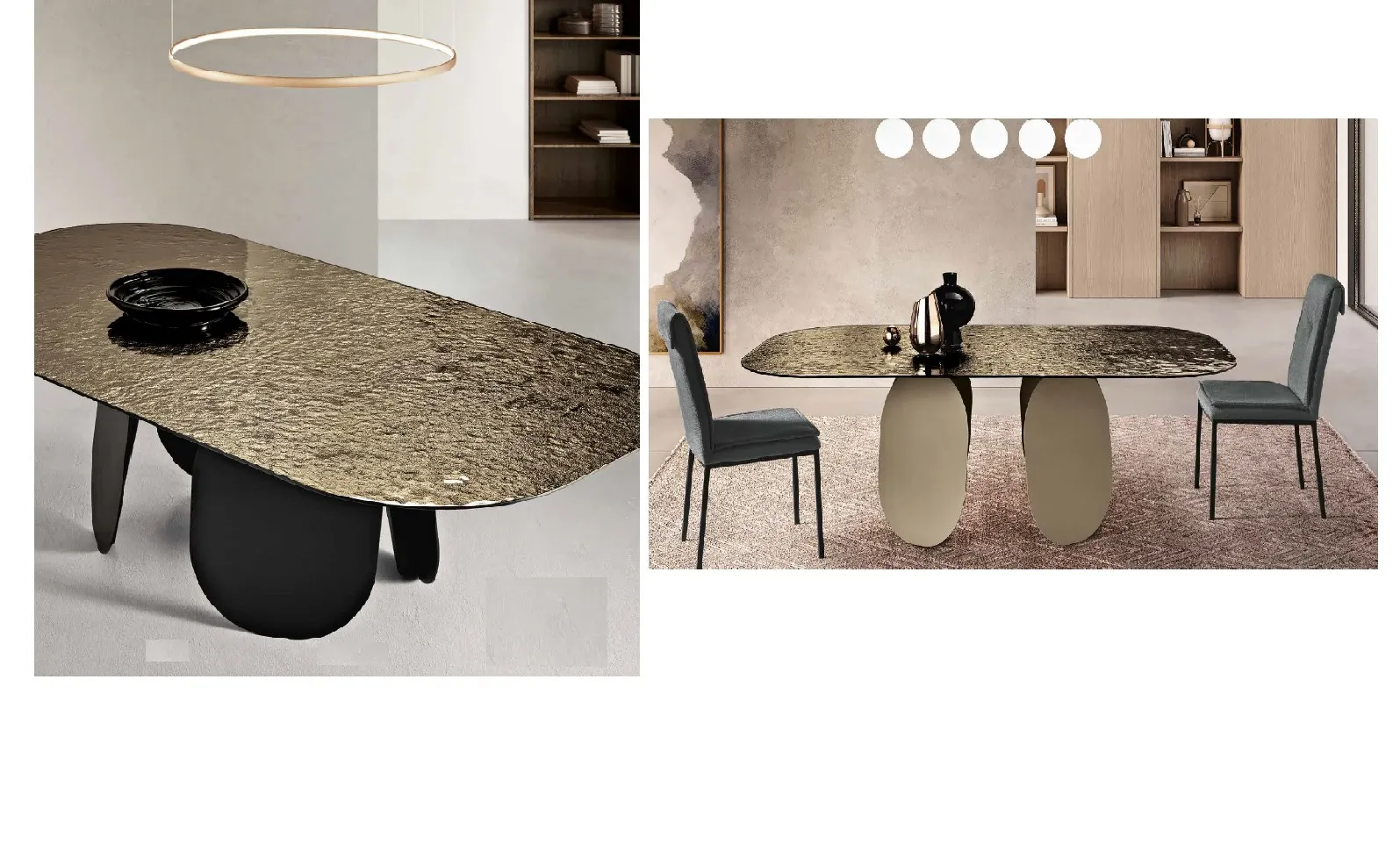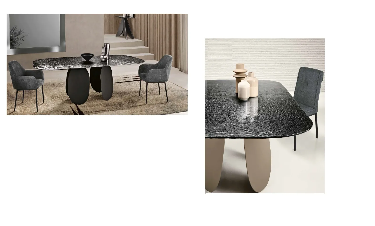 Tavolo di alta gamma dal carattere raffinato e contemporaneo, con base in metallo verniciato nelle eleganti finiture nero o perla beige.