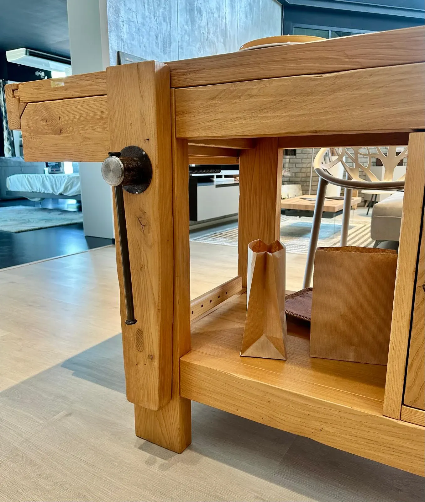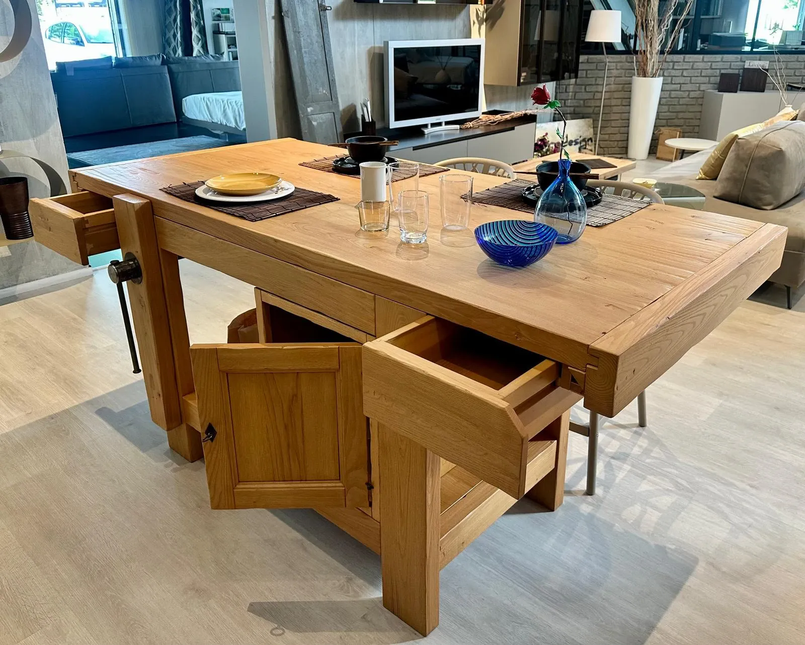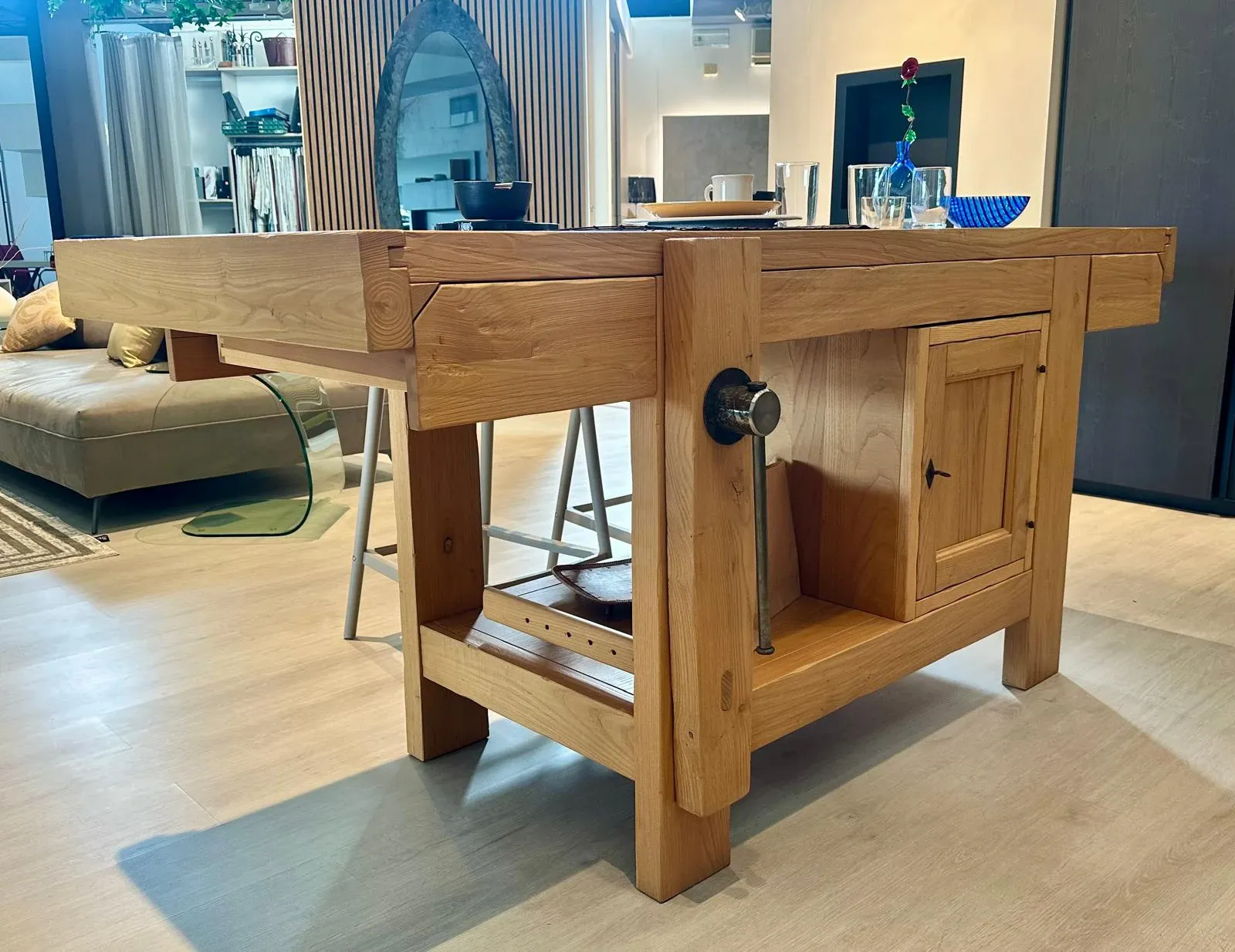 una morsa che richiama il banco lavoro e due cassetti contenitivi e una anta dispensa. Inoltre c'è anche un pratico vano a giorno.