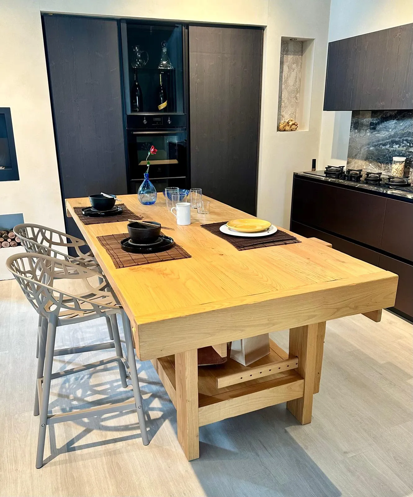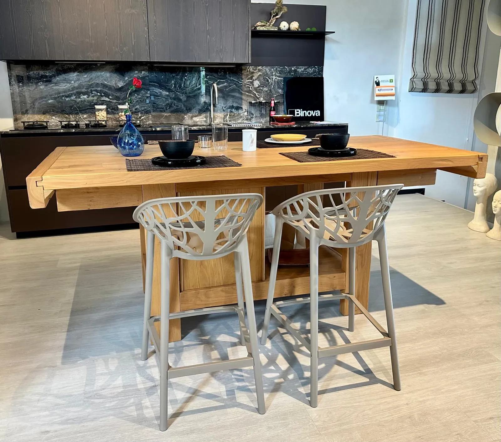 Sul lato opposto possono essere aggiunti degli sgabelli per i momenti conviviali.
