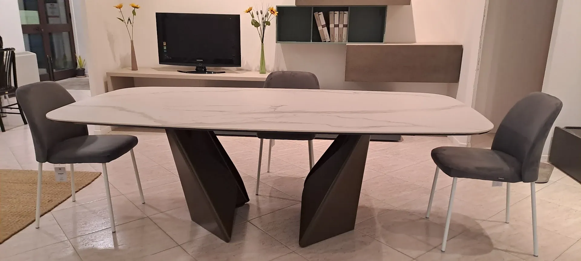 Per merito della gamma di tavoli di forme particolari e di grande personalità avrai la possibilità di decorare su misura, in modo veloce ed attuale, i locali interni seguendo il tuo gusto personale. In negozio presentiamo un'ampia gamma di tavoli innovativi, come questo modello Bontempi sagomato, che permettono di decorare i locali interni di diverse misure, creando peculiari atmosfere rilassanti, accattivanti e accoglienti. Gli spazi indoor devono essere conformi alle aspettative di chi li vive e i pezzi di arredo non devono assolutamente risultare ingombranti, quindi è fondamentale selezionarli anche in base alle loro misure; il tavolo Fisso Bontempi qui visibile va da 191 a 220 cm in lunghezza, risultando così ideale per un luogo di diverse misure. I tavoli sono, insieme alle sedie, i pezzi di arredo più fondamentali in ogni abitazione, proprio per questo è fondamentale sceglierli in base alle aspettative pratiche ed estetiche: questo tavolo Kaleido consta di un piano in ceramica di grande personalità, resistente negli anni e in grado di la conservazione le doti estetiche del materiale, assicurandoti al contempo di avere un piano d'appoggio sempre disponibile. Non farà differenza che tu voglia disporre il tuo tavolo Kaleido nel living o nella cucina, ciò che è certo è che, grazie alla sua struttura con basamento centrale, si inserirà in modo ottimale negli ambienti decretati senza mai passare inosservato. Questo tavolo è l'acquisto perfetto per le aspettative di ciascuno, poiché in grado di abbinare praticità e design grazie a qualità dei materiali e design unico; che tu voglia completare un locale di ogni stile, sia esso legato alla tradizione o minimal chic, il tavolo Kaleido fisso saprà esaltare le doti estetiche del locale pur rimanendo essenziale dal punto di vista pratico.