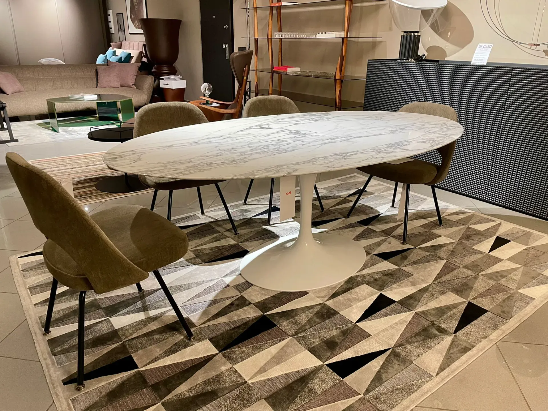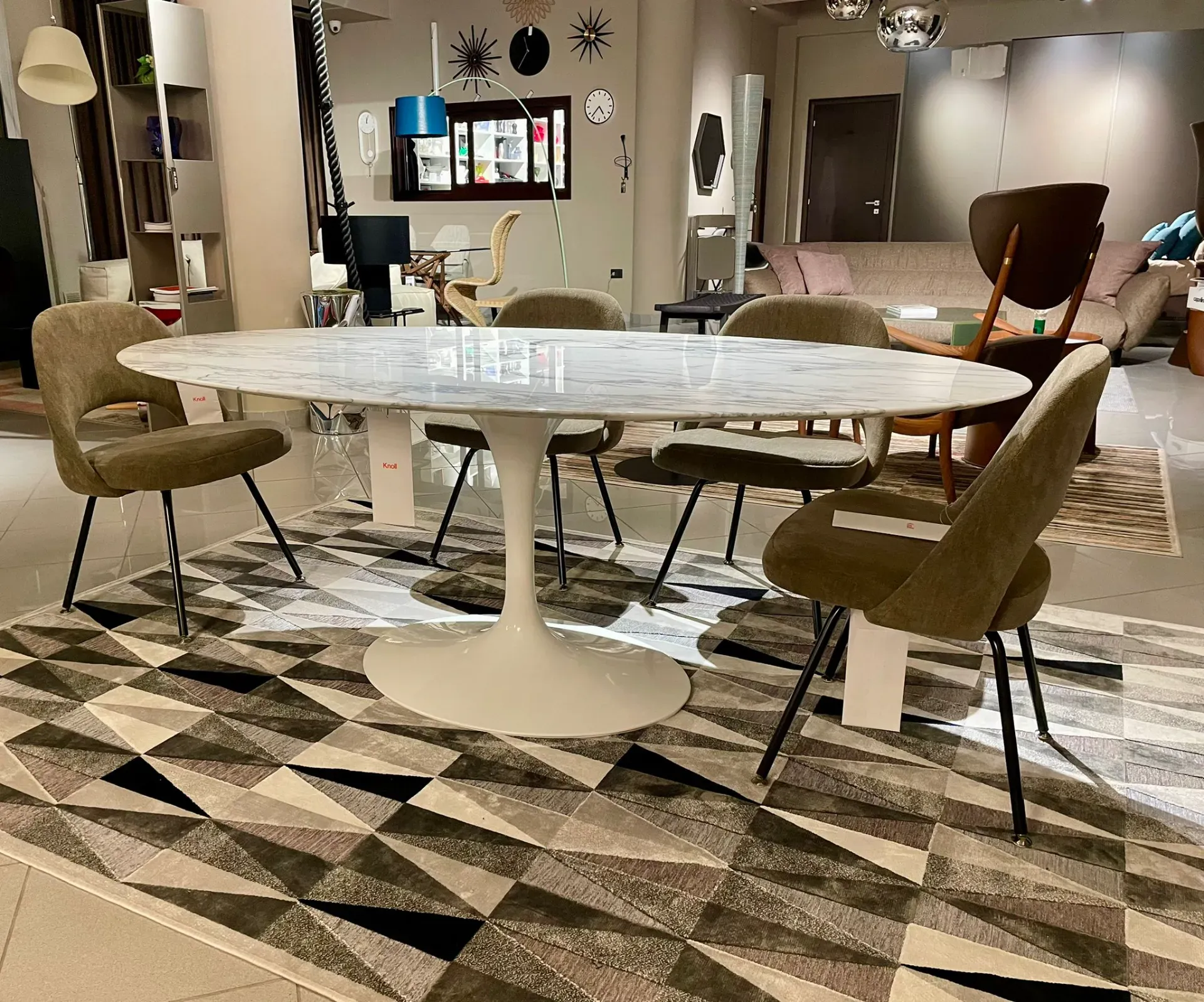 Tavolo Knoll modello Saarinen Ovale. Versione con base bianca e piano in marmo arabescato. Dimensioni L 198 × P 121 x 72/73.