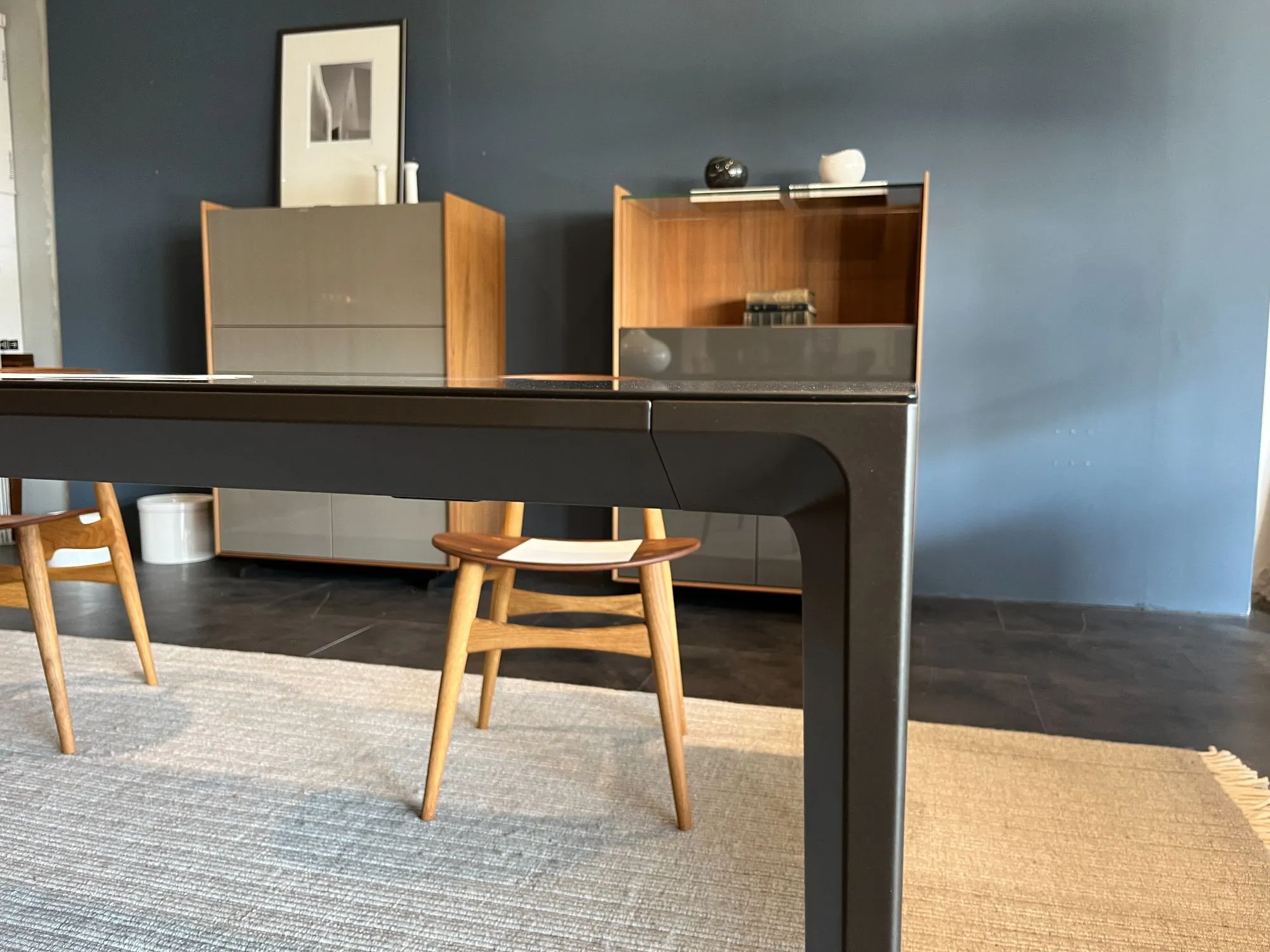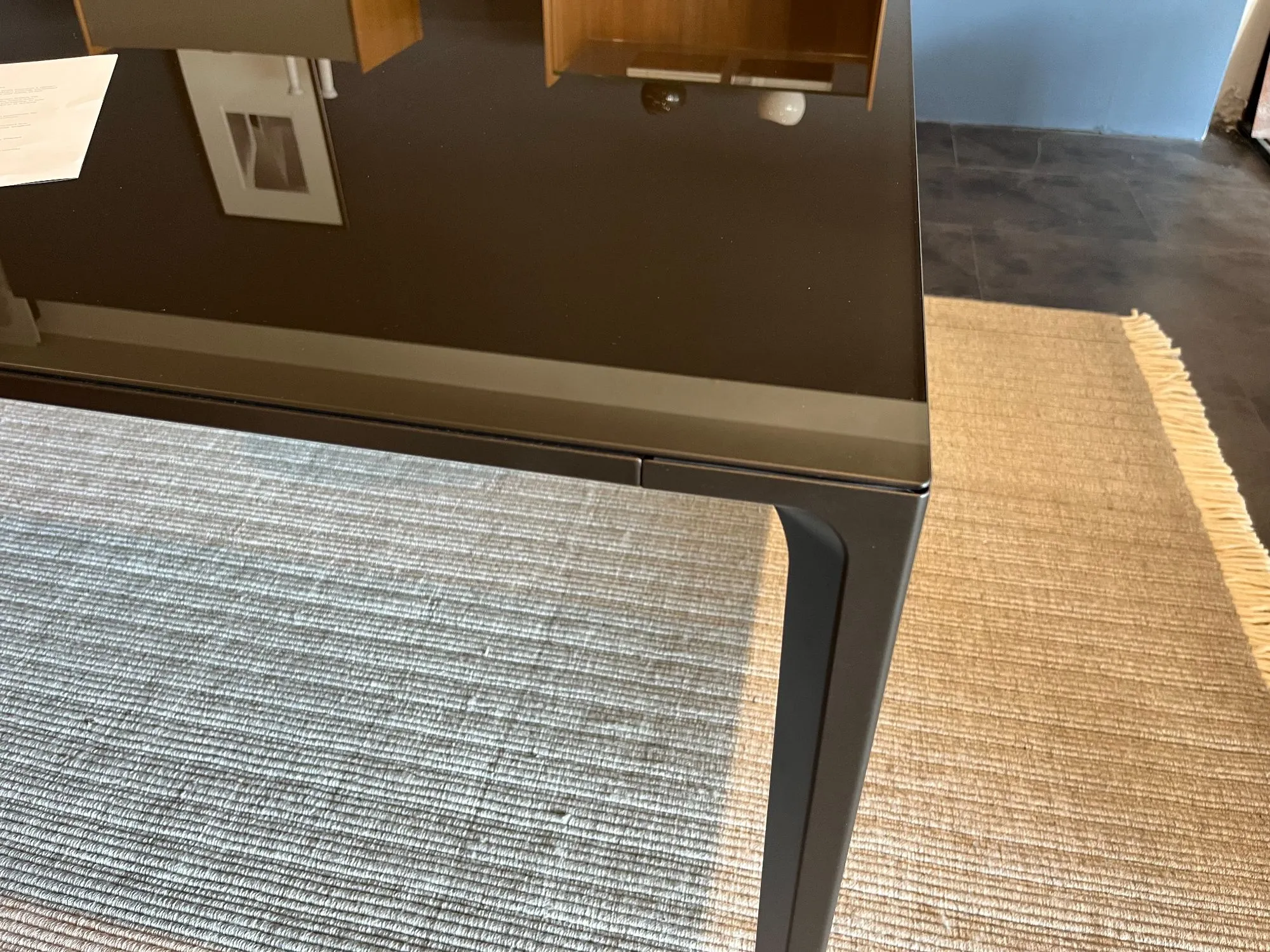 Marca: RIMADESIO Modello: LONG ISLAND Tipologia: Tavolo Finiture: struttura Brown, vetro Moro Misure: larghezza 2400, profondità 1000, altezza 750