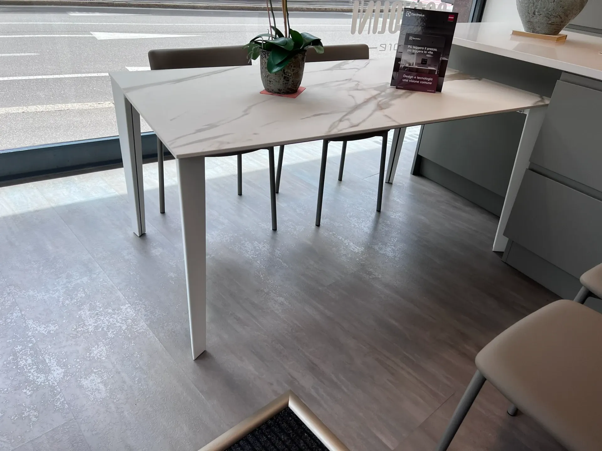 Il Tavolo Mary di Scavolini rappresenta l'incontro perfetto tra eleganza e funzionalità, pensato per arricchire cucine e open space con il suo design raffinato. Il suo basamento bianco si sposa armoniosamente con il top in gres Abitum finitura Calacatta Delicato, creando un contrasto visivo che esalta la bellezza del marmo naturale. Questo tavolo allungabile è la soluzione ideale per chi cerca flessibilità, grazie alle due allunghe in laminato bianco che permettono di estenderlo facilmente.