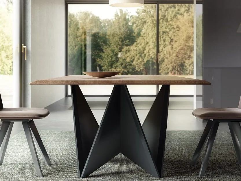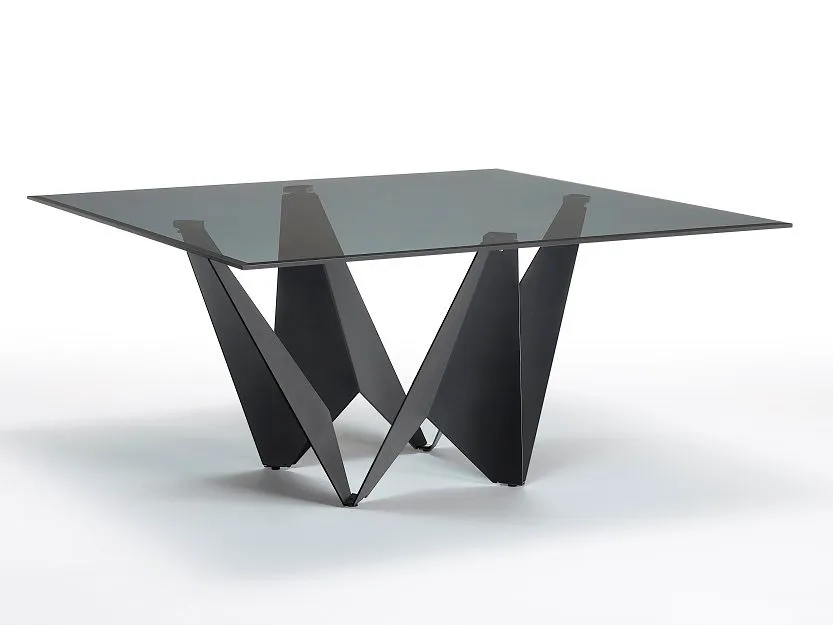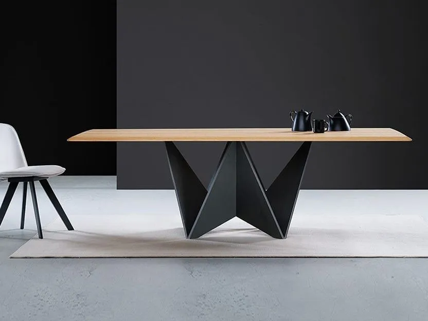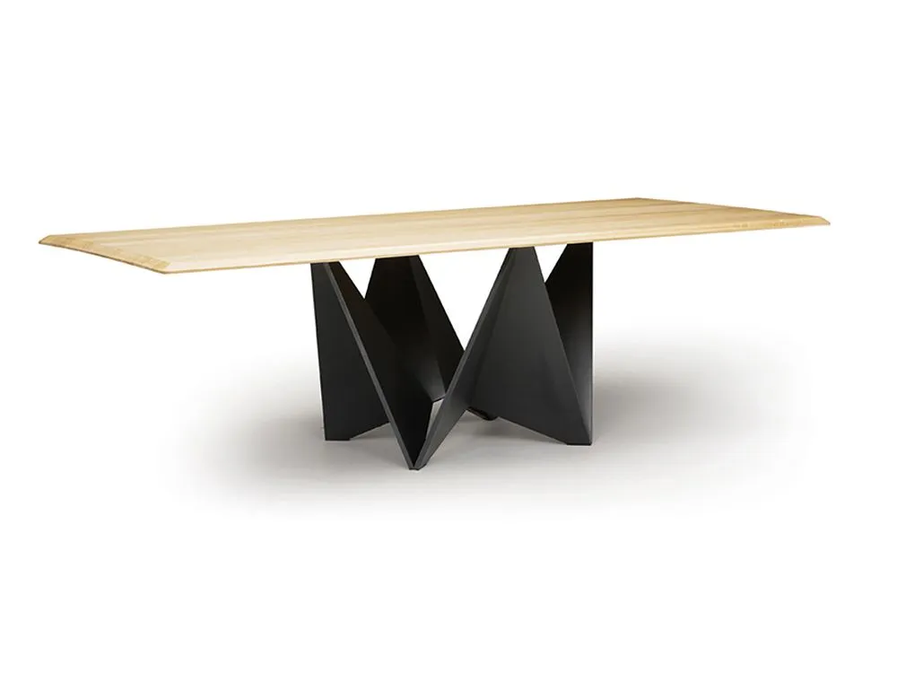 In questa versione fissa del tavolo Origami, il basamento in metallo è disponibile nella finitura laccato grigio nero. Il piano è disponibile in impiallacciato e in rovere massiccio che mette in risalto tutta la particolarità della struttura.
