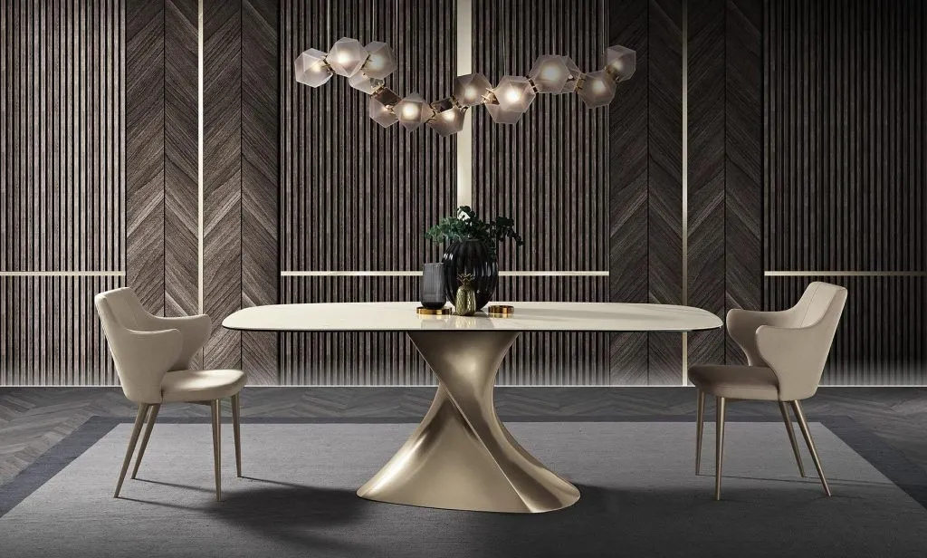 TAVOLO CON BASAMENTO ELICOIDALE STRUTTURA IN METALLO LACCATO PEARL BEIGE E PIANO IN VETROCERAMICA A BOTTE 200X100 FINITURA CALACATTA ORO VENATO LUCIDO
