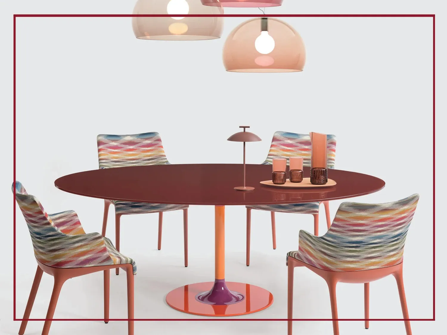 Una soluzione d arredo passe-partout per più occasioni d uso, caratterizzata da gambe in metallo e piani in vetro dalle cromie vibranti come gemme preziose.
