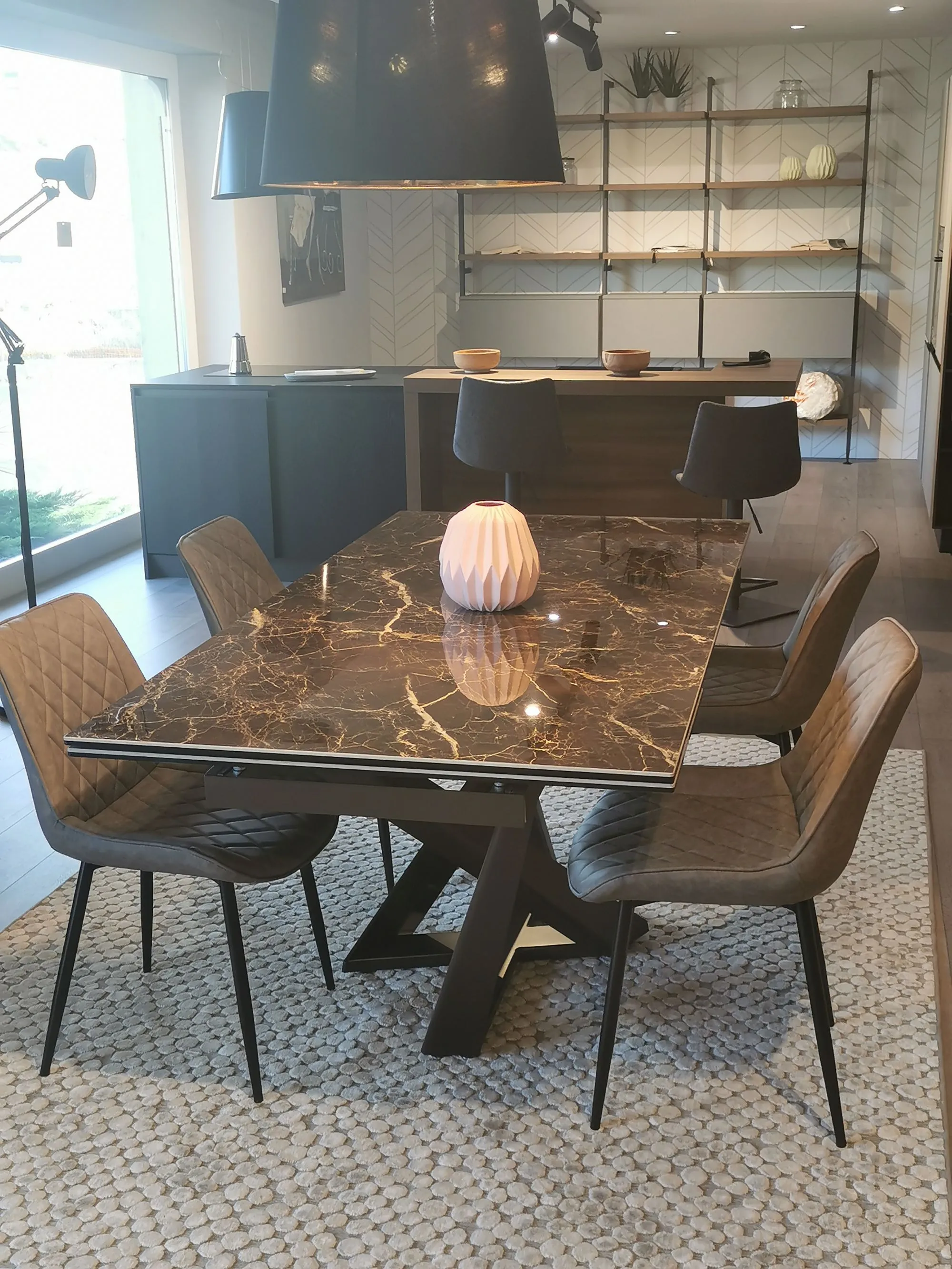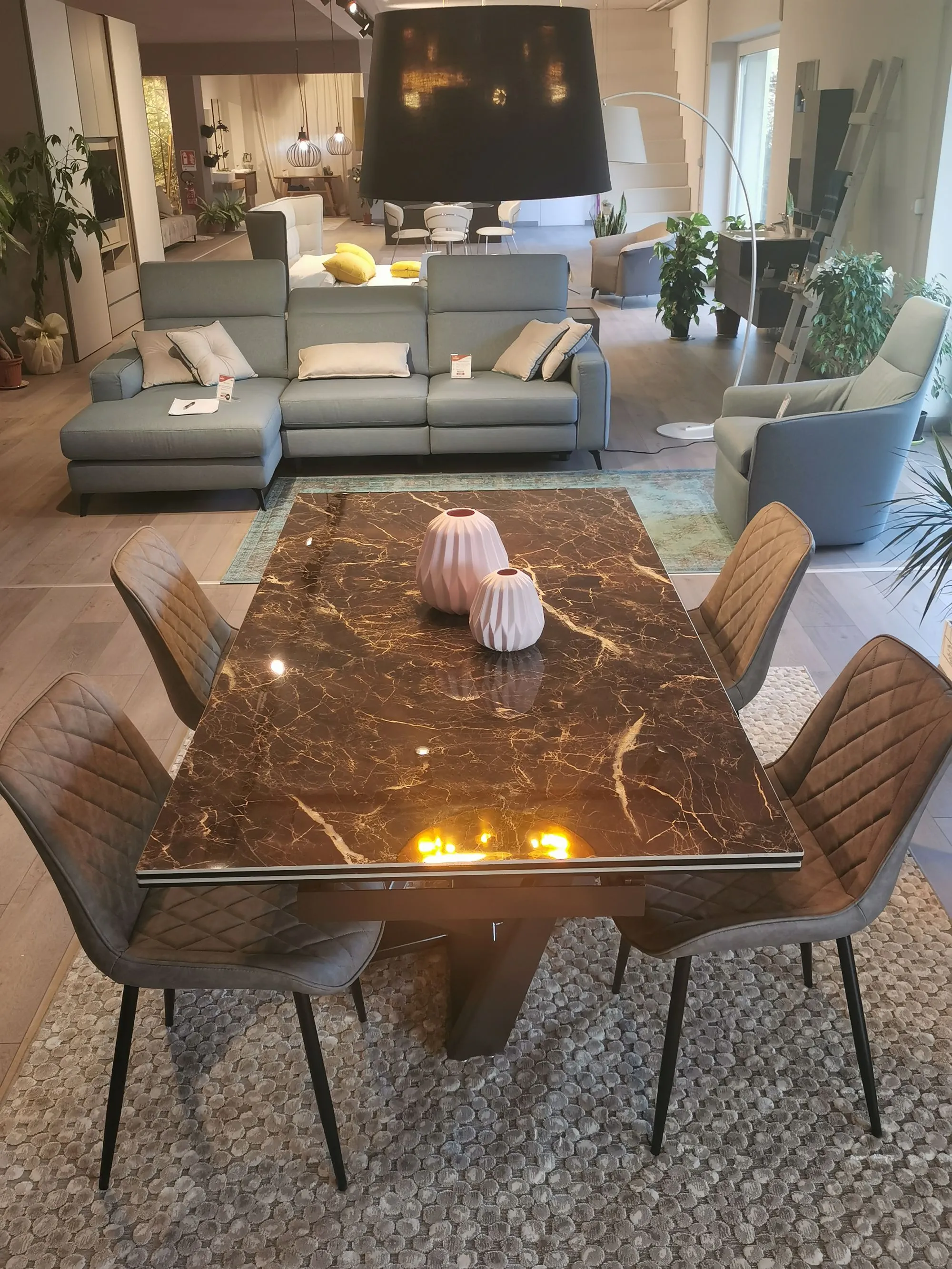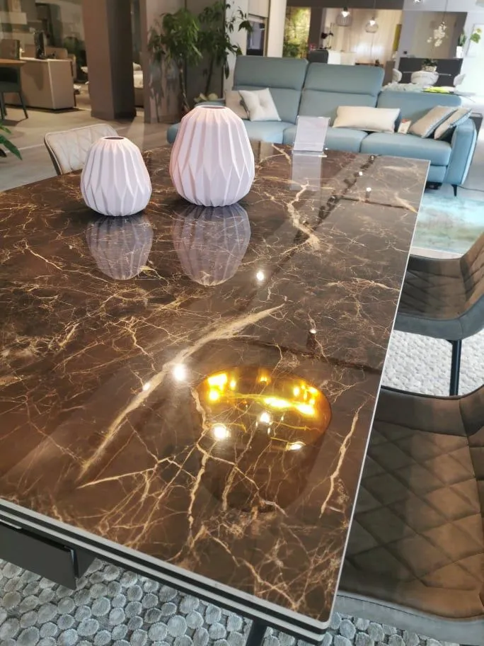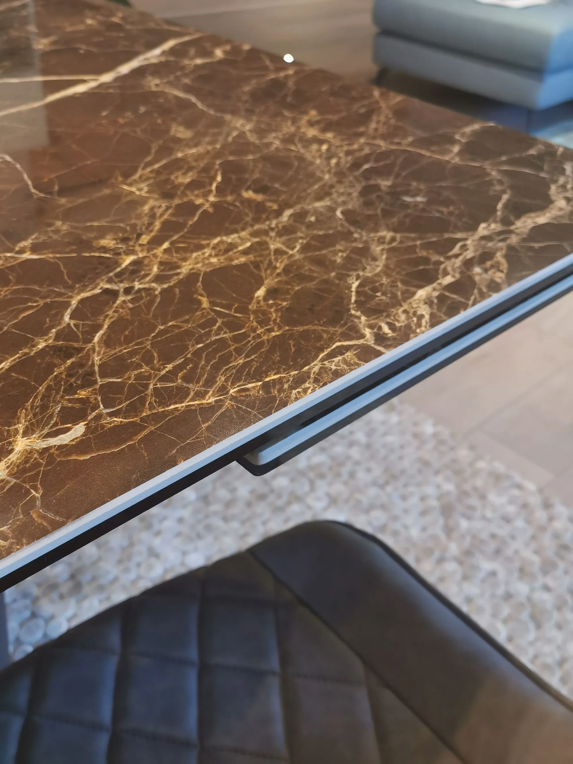 In linea con le tendenze del mercato, PRIAMO è un tavolo moderno allungabile disponibile con classica finitura di gres porcellanato Grafite e con nuove ed eleganti finiture di gres porcellanato con effetto marmo, caratterizzate da toni che spaziano dai caldi avvolgenti del marmo Emperador fino ai freddi dei marmo Carrara e Arabescato.