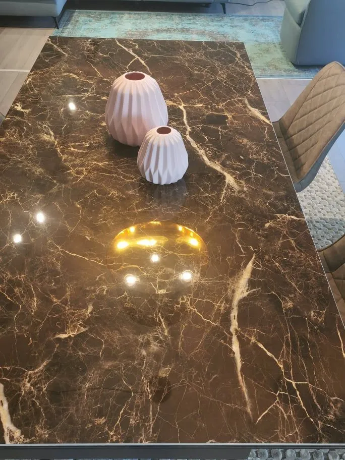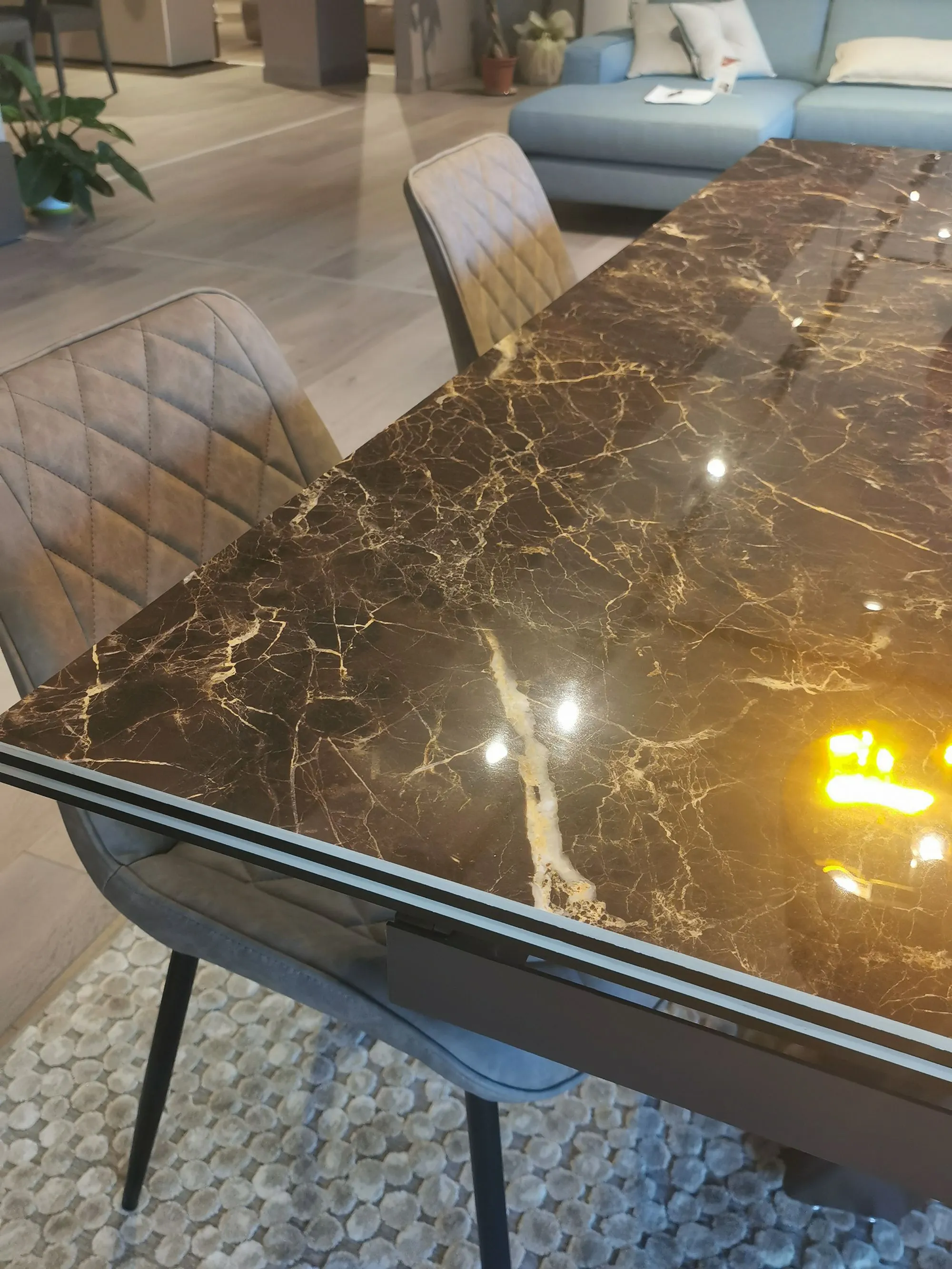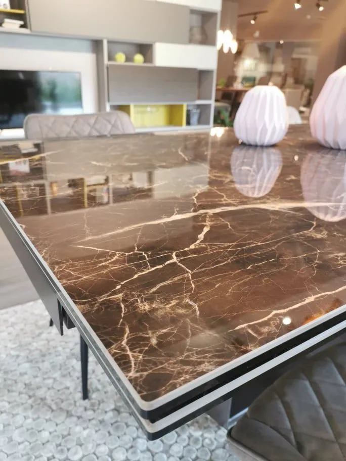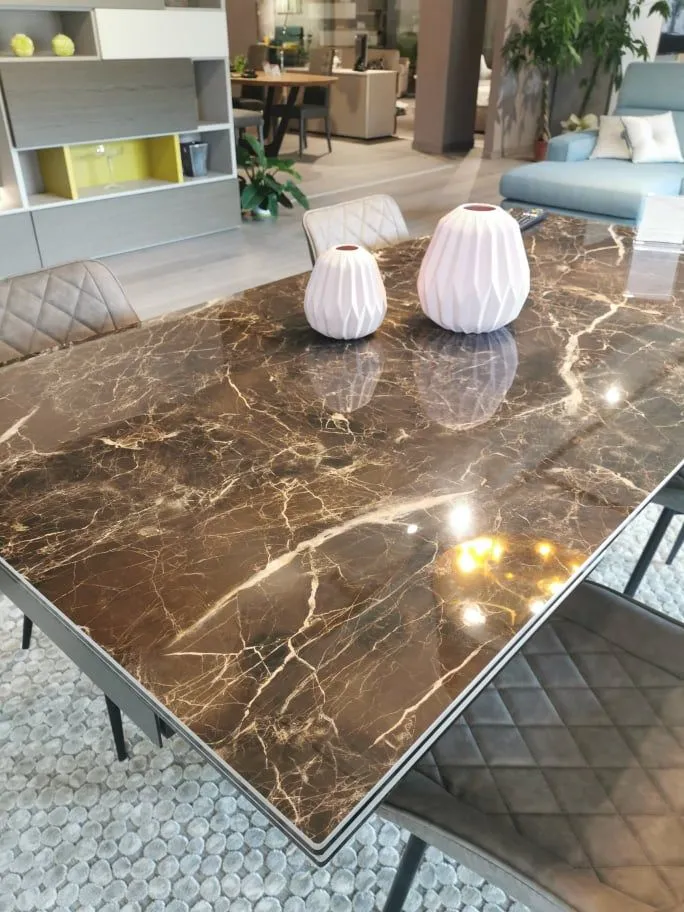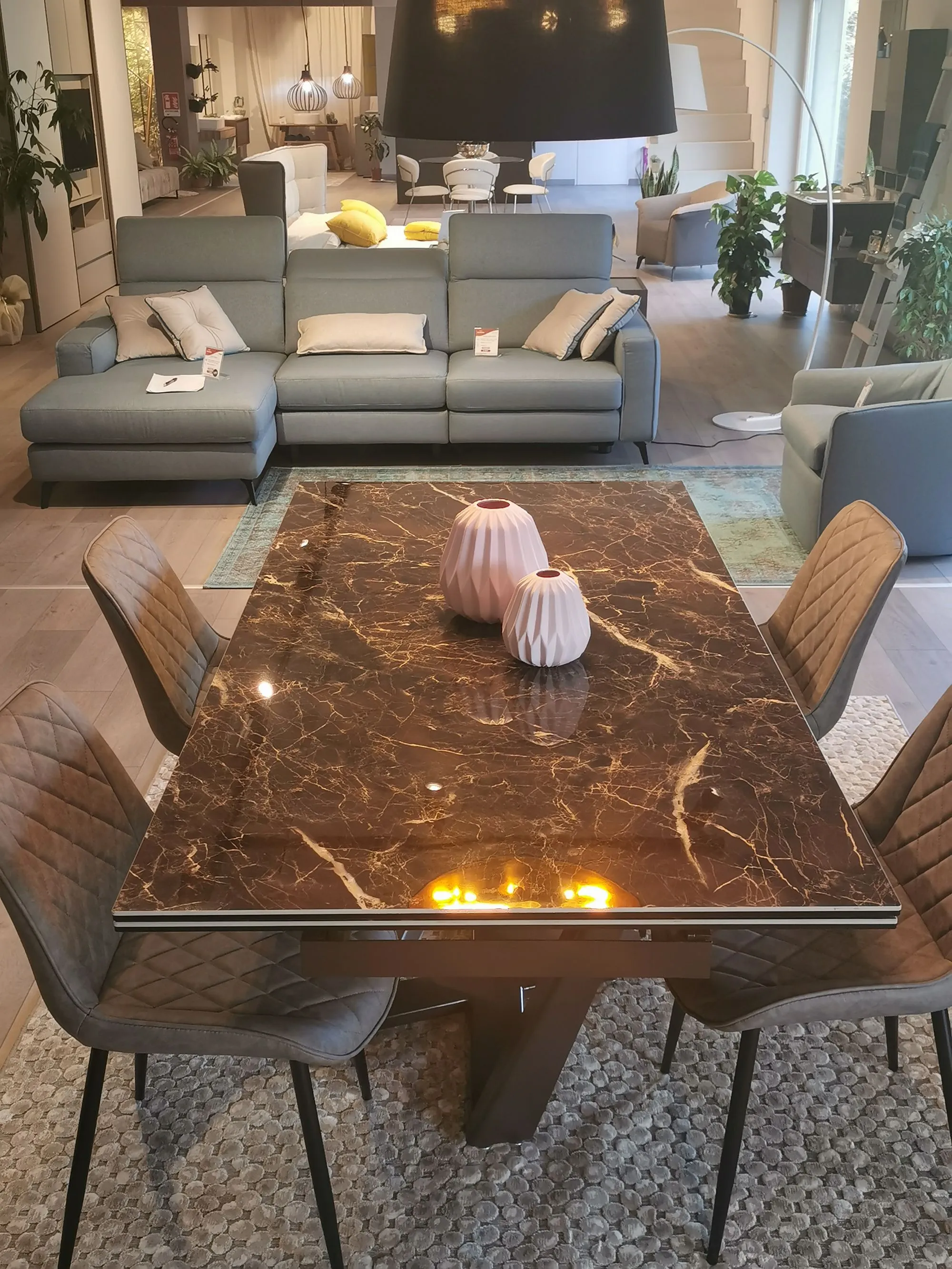 In linea con le tendenze del mercato, PRIAMO è un tavolo moderno allungabile disponibile con classica finitura di gres porcellanato Grafite e con nuove ed eleganti finiture di gres porcellanato con effetto marmo, caratterizzate da toni che spaziano dai caldi avvolgenti del marmo Emperador fino ai freddi dei marmo Carrara e Arabescato.