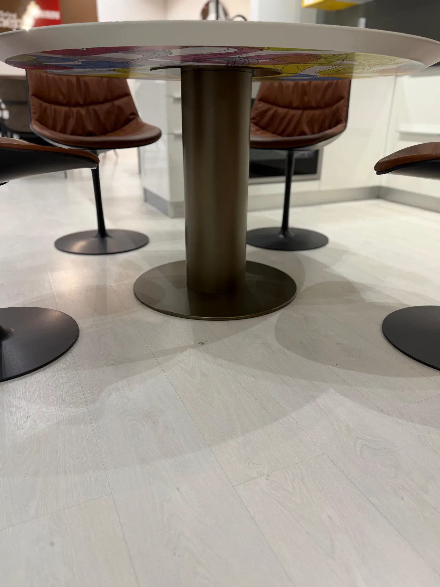 Il tavolo 63° rotondo di De Rosso è una soluzione di design elegante e minimale pensata per spazi living o dining. Secondo l'annuncio, il piano è realizzato in laminato HPL, rivestito senza giunzioni per garantire continuità e un estetica pulita.