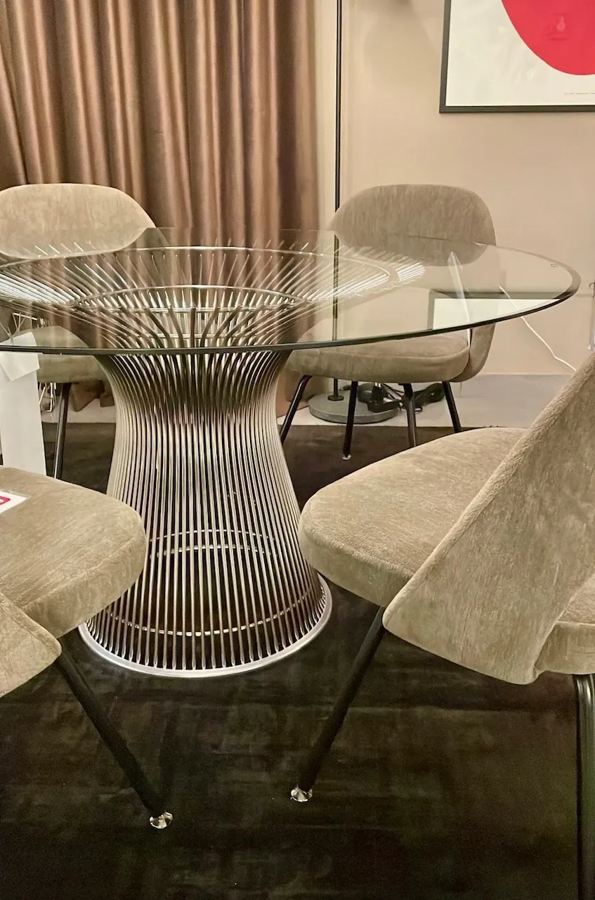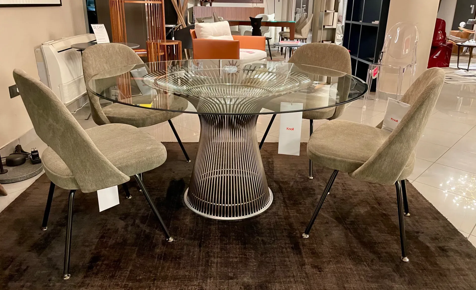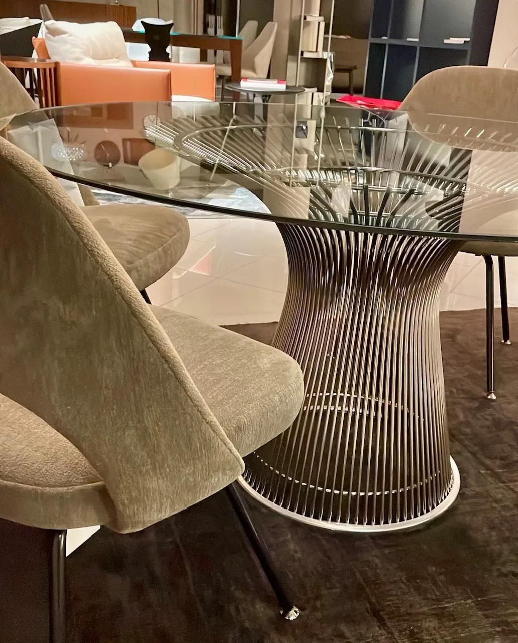 Tavolo Platner di Knoll rappresenta un'elegante esempio di design contemporaneo, capace di adattarsi a qualunque contesto senza difficoltà. Nato dall'ingegno del designer Warren Platner, è costituito da tondini metallici sagomati in verticale e orizzontale che danno vita a una caratteristica fascia aperta nella parte superiore dove viene adagiato il piano.