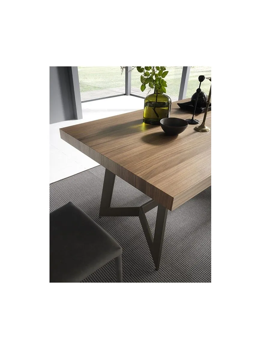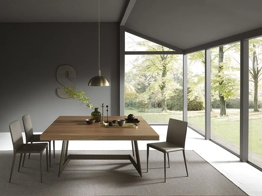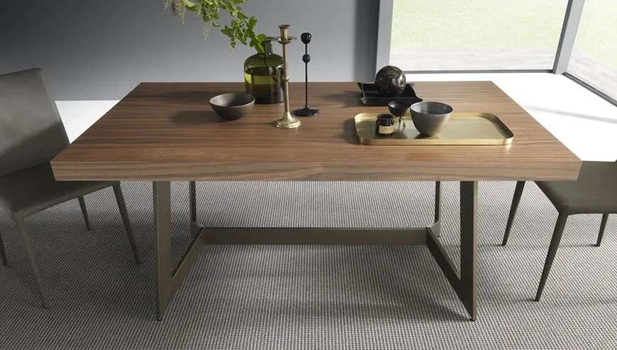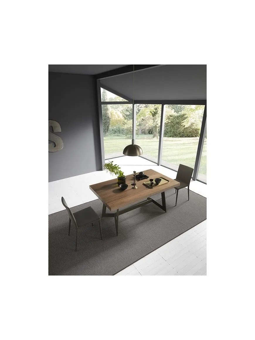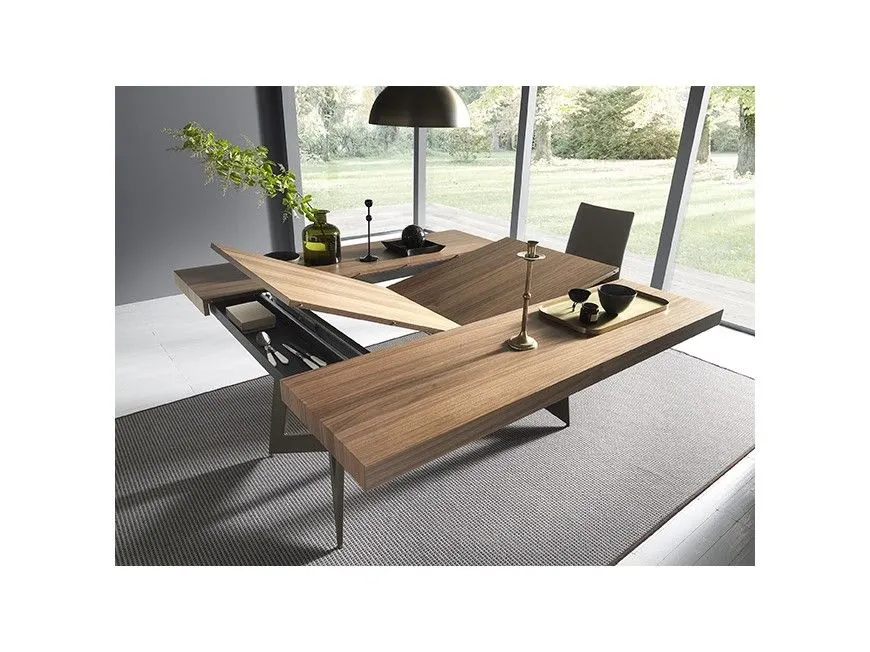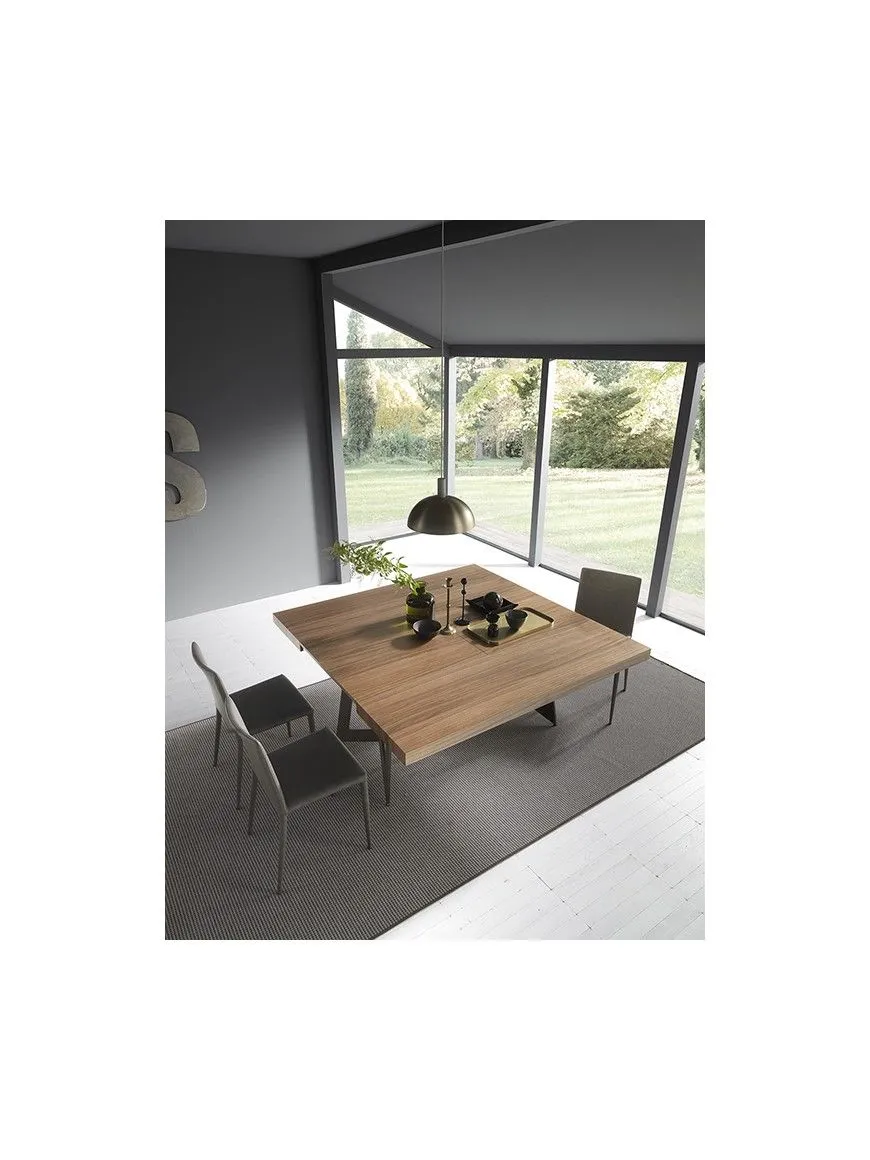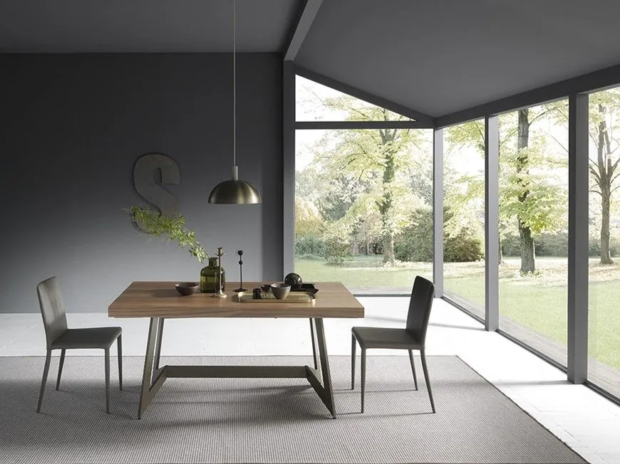 Tavolo da pranzo allungabile, struttura in metallo, meccanismo telescopico, piano in nobilitato, legno o effetto malta, prolunga interna a libro.