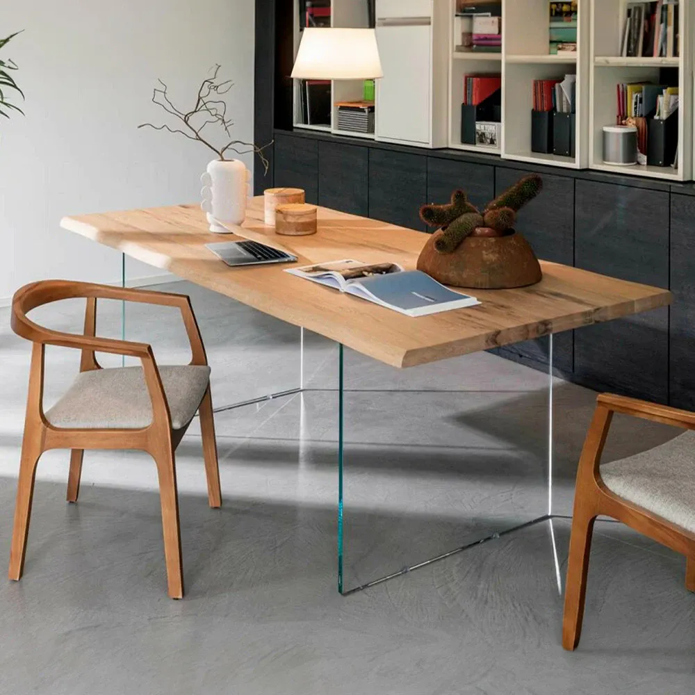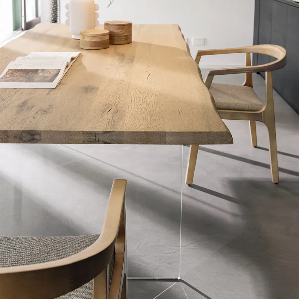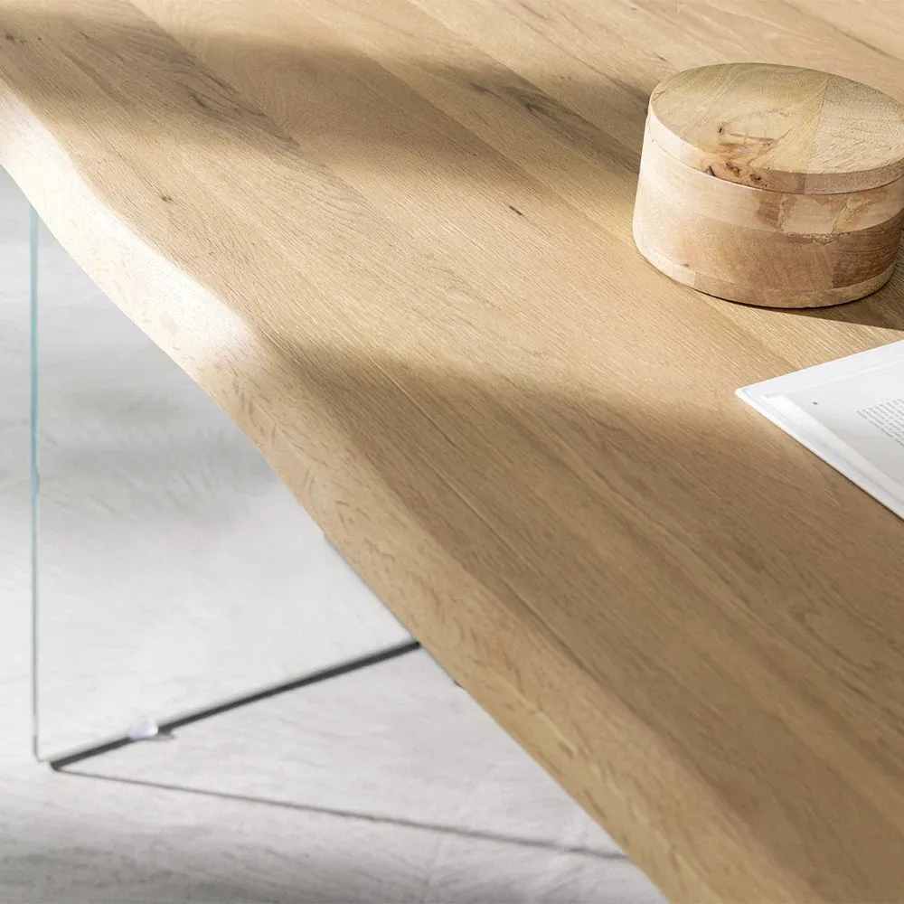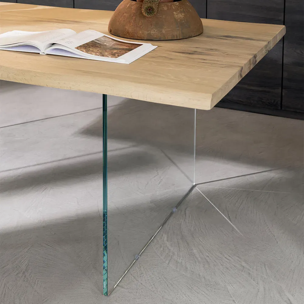 Dalla linea RIVANOVA di ALTA CORTE, il Tavolo SPIKE con piano rettangolare, fisso o allungabile a mezzo allunghe da 50 cm, con gambe in vetro temperato extra chiaro dallo spessore di soli 15 mm abbinabile a piani con spessori 40 o 60 mm e bordo dritto, irregolare o inclinato in legno di cerro massello europeo o rovere massello europeo, con spessori 30 mm, con bordi inclinati o irregolari, disponibili varie finiture. Collanti vinilici all' acqua, vernici acriliche bicomponenti. Le gambe possono essere posizionate in modo parallelo o perpendicolari. Il tavolo è da montare