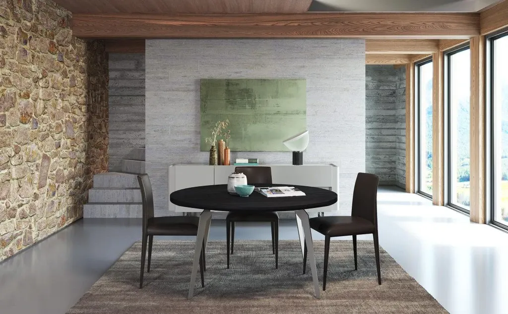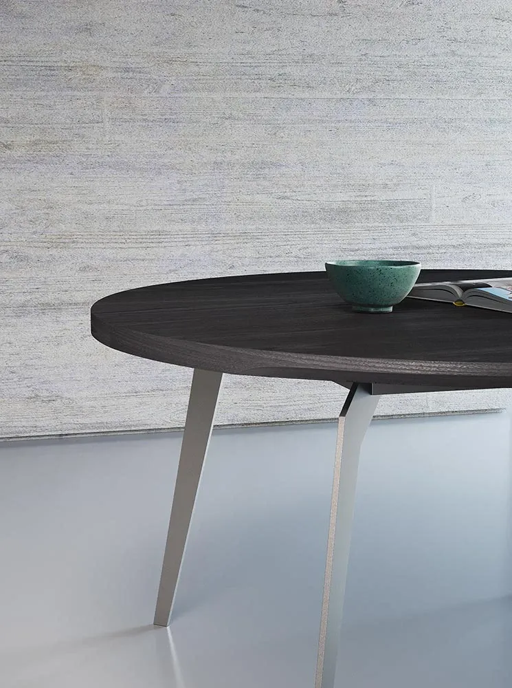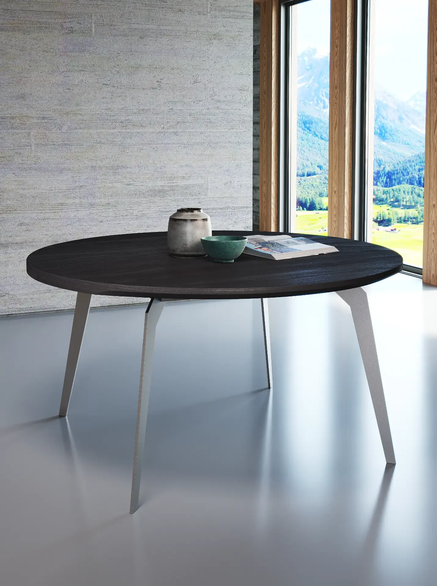 Tavolo rotondo di ottima qualità in finitura legno olmo autunno con diametro cm 120- Le gambe sono in metallo opaco colore champagne e sono lavorate e sagomate -