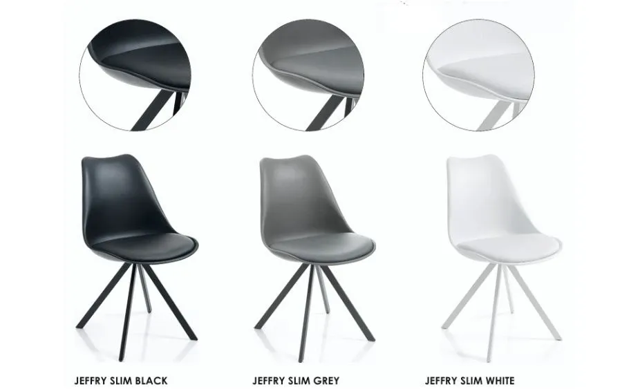 Disponibili in abbinamento anche le sedie imbottite JEFFRY SLIM, per un set coordinato e di grande stile.