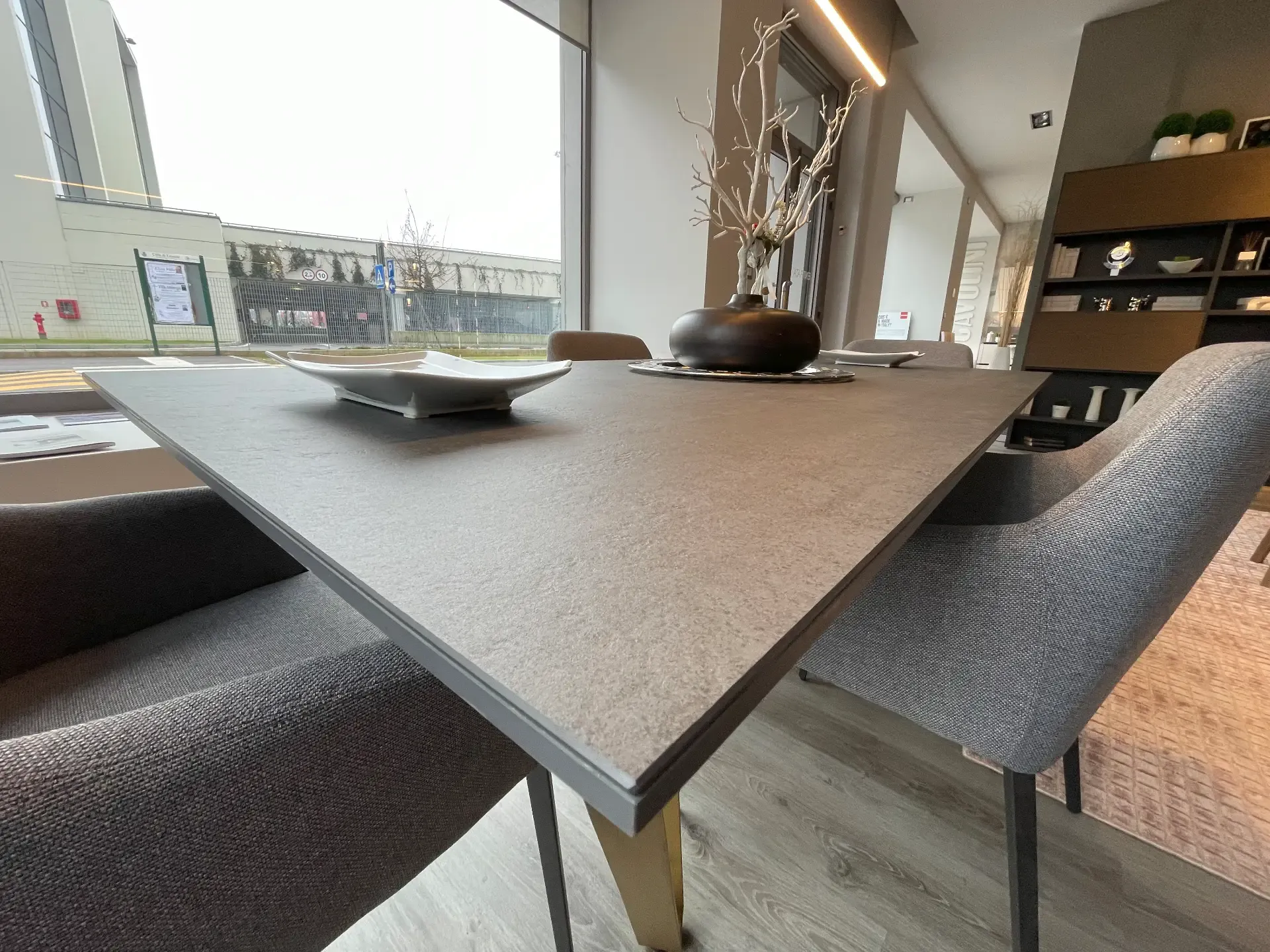 Eleganza pura: piano in gres cemento e gambe in ottone spennellato