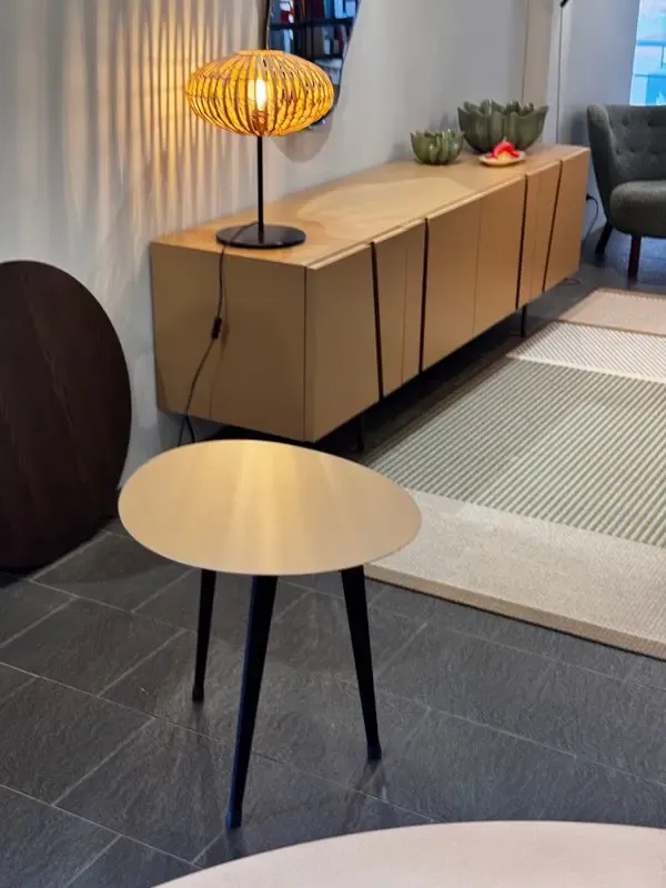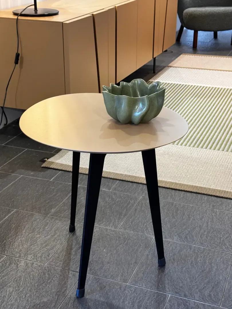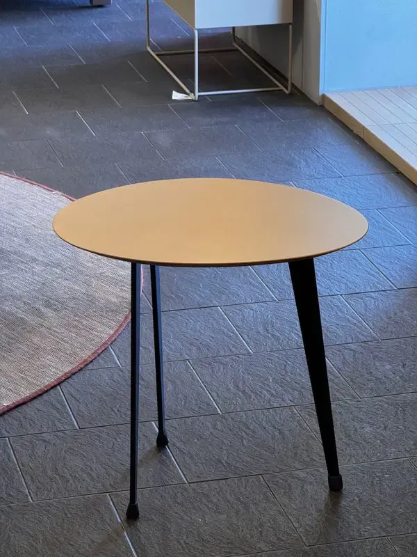 Tavolino di servizio storico per questo oggetto multiuso disegnato per Lema da Roberto Lazzeroni. Basamento in metallo verniciato nero e piano a forma di goccia laccato opaco biscotto.