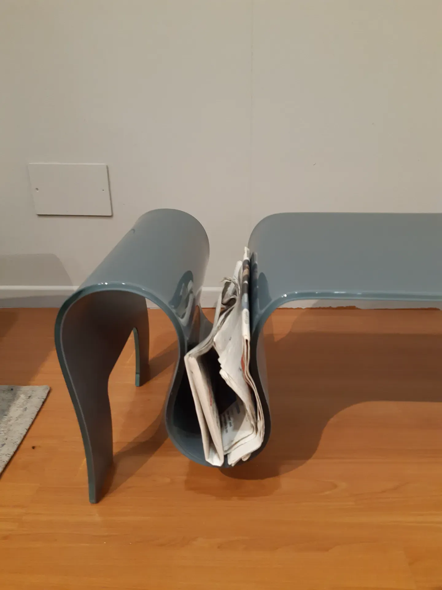 La particolare curvatura, realizzata lavorando un'unica lastra di vetro, consente anche di ricavare un pratico scpazio per libri e giornali.