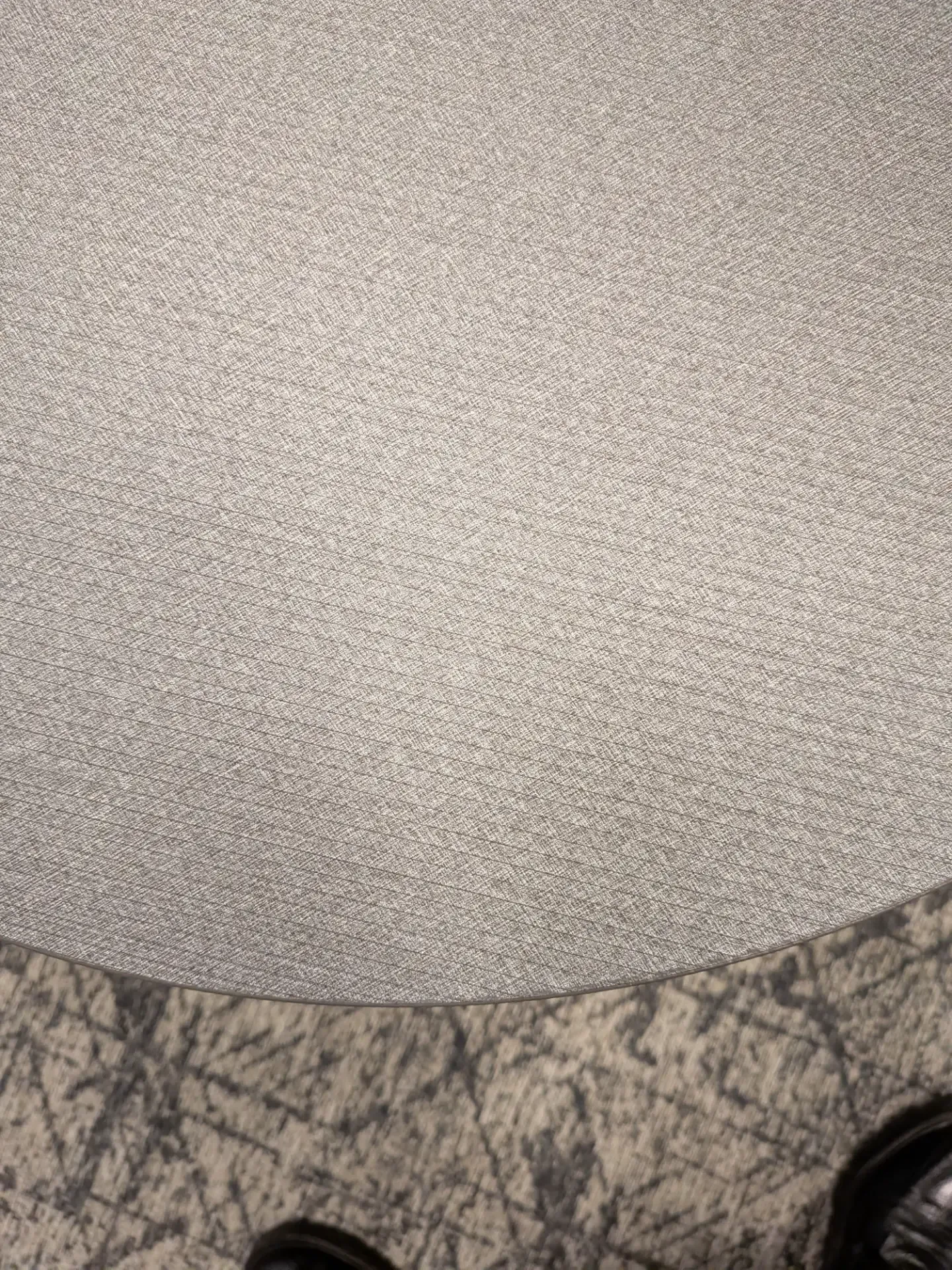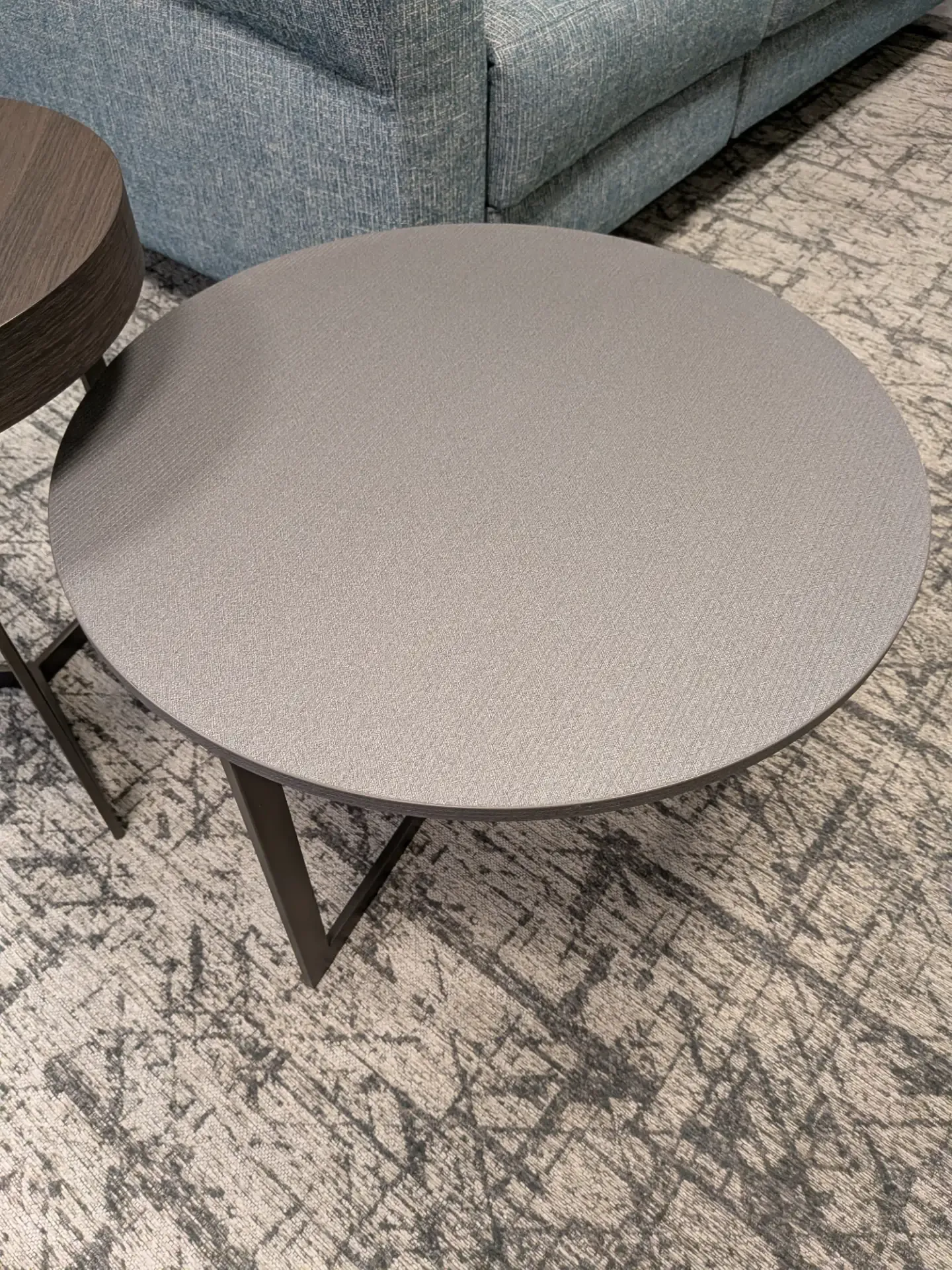 01 Tavolino Joy struttura metallo antracite, piano sopra materico laminato paglia grigio.