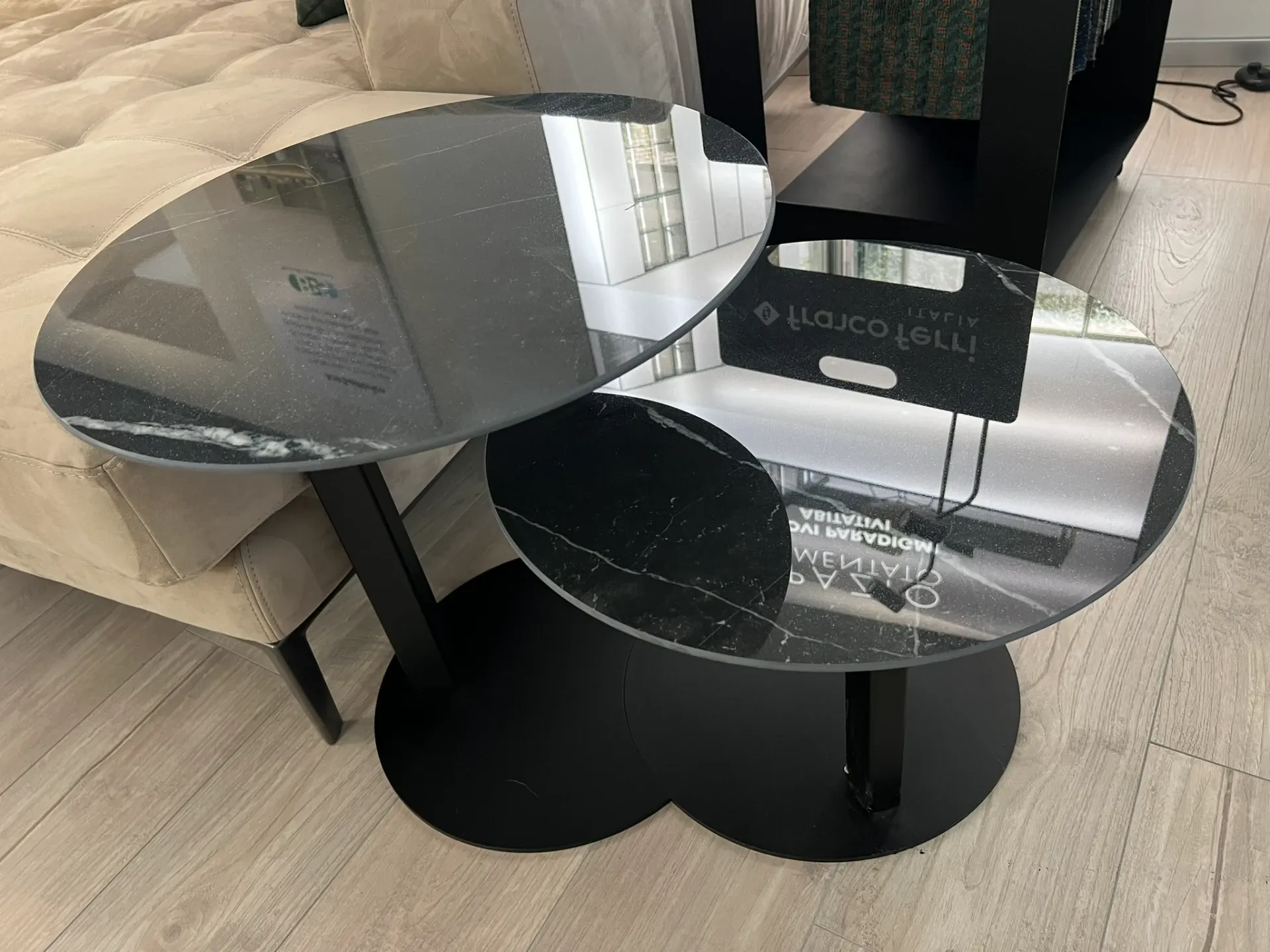 I tavolini Brick di Di Lazzaro conquistano con il fascino intenso della ceramica calacatta black lucida, impreziosita da venature eleganti, e la solidità della base in acciaio nero dal design contemporaneo.
