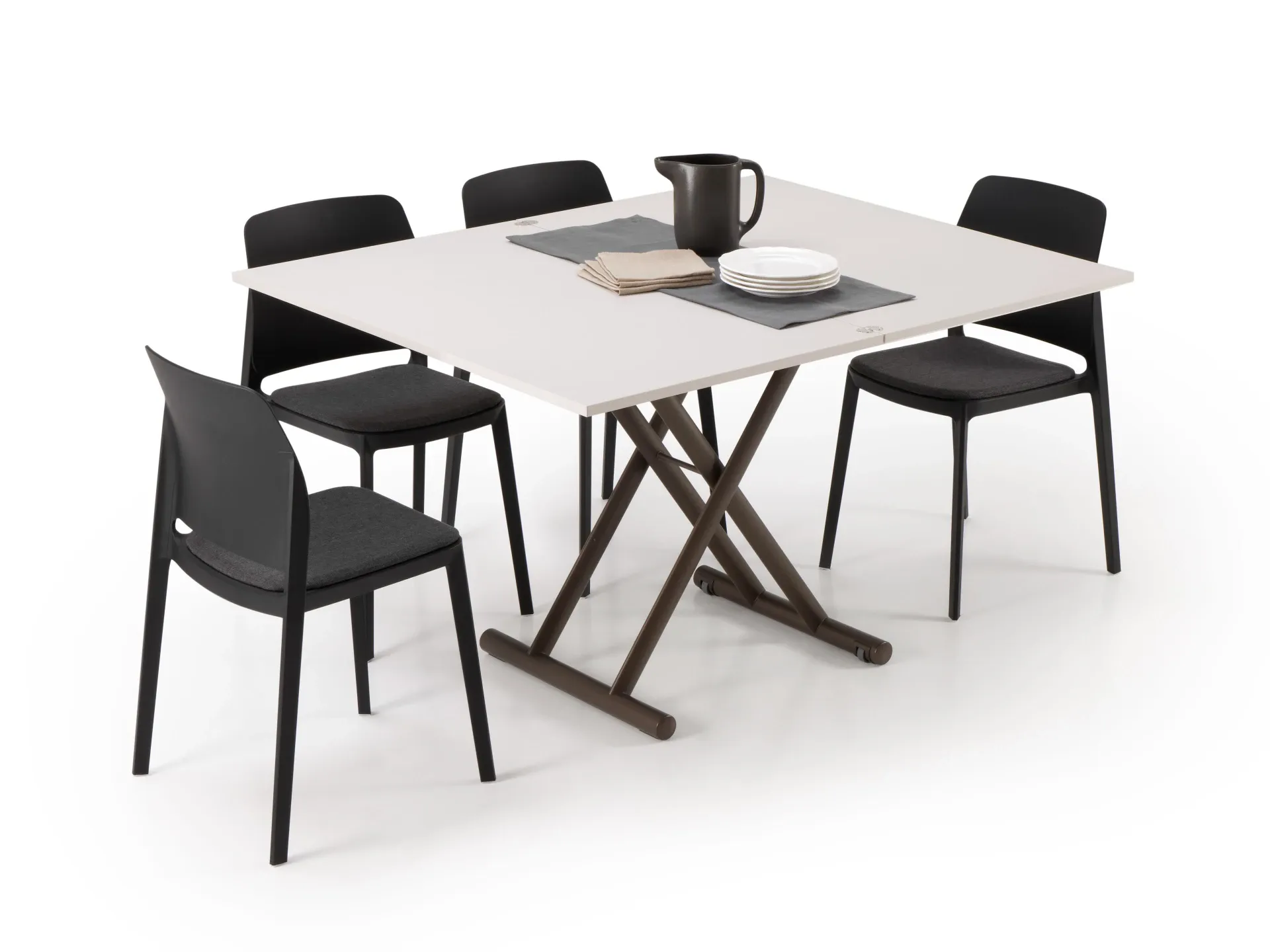 Bento Outlet è un tavolino trasformabile ad altezza regolabile, dotato di un piano a libro che può essere raddoppiato in lunghezza, permettendone l'utilizzo come tavolo da pranzo per fino a 6 persone.