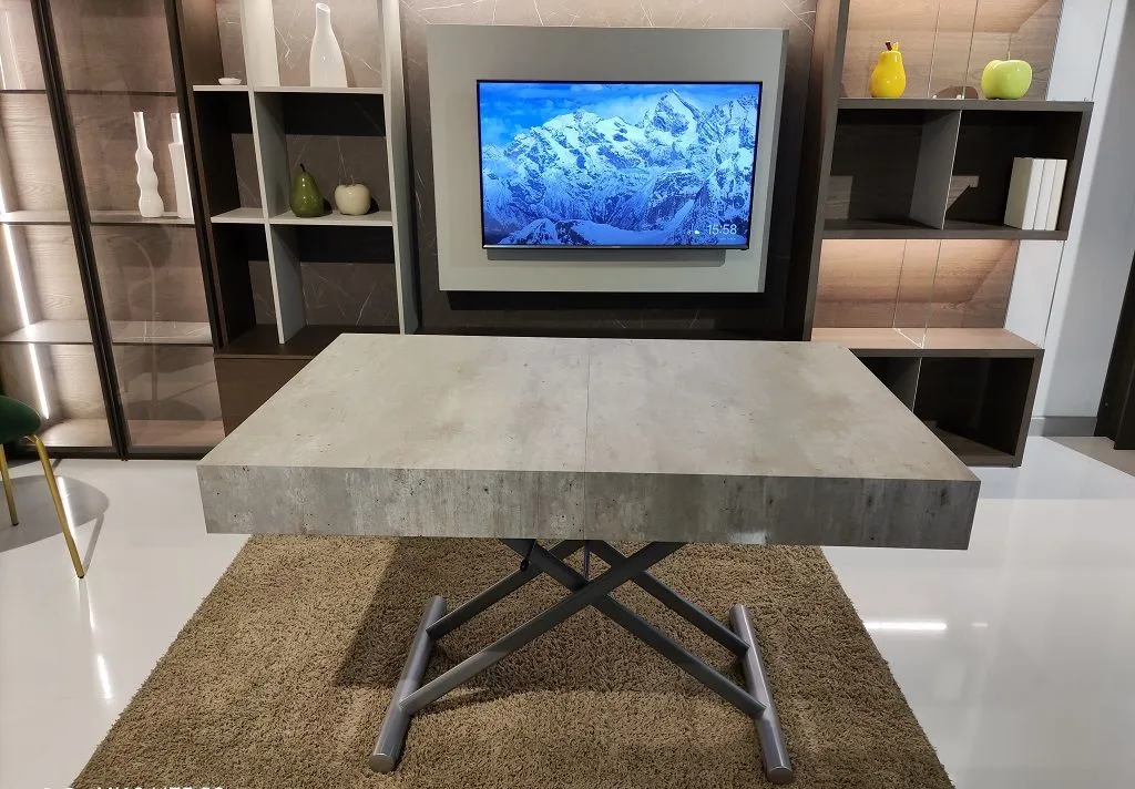 Tavolino Saliscendi mod. BLOCK by LA SEGGIOLA in finitura CEMENTO VISSUTO. 4 tavoli in 1, infatti oltre ad essere un coffee table, appena si solleva diventa un tavolo da pranzo, con la possibilità di allungarlo 3 volte, quindi a seconda del numero degli ospiti, abbiamo la possibilità si scegliere la dimensione del tavolo.