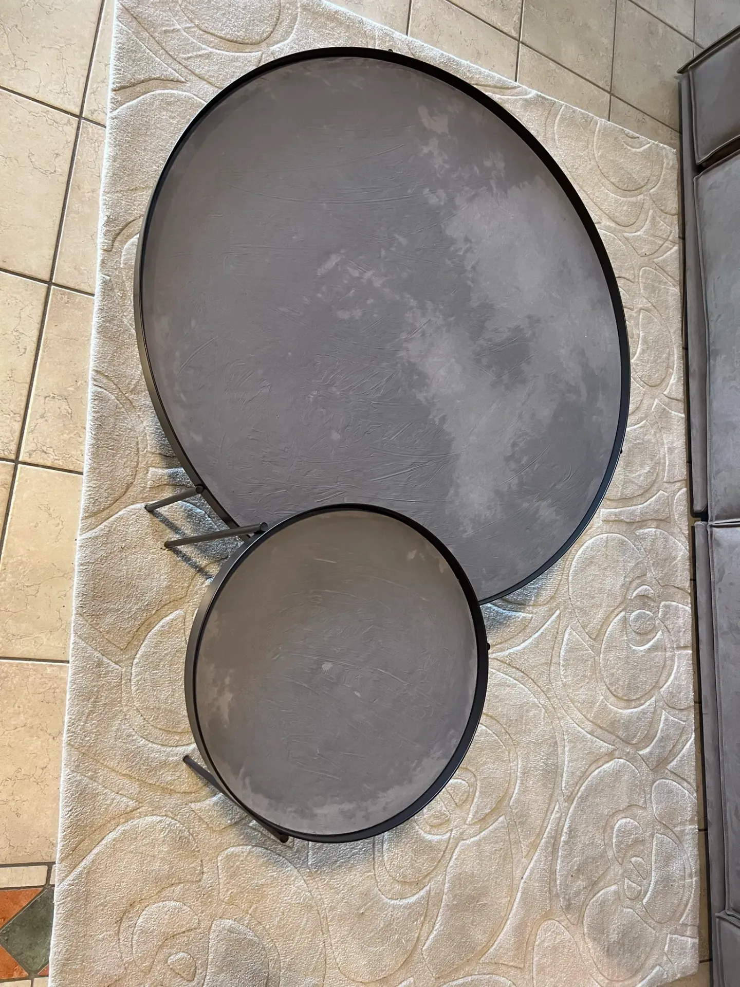 Tavolino dalla linea minimale e pulita con struttura in metallo a tre piedi, sormontata da un vassoio circolare con bordi alti realizzato in cemento.