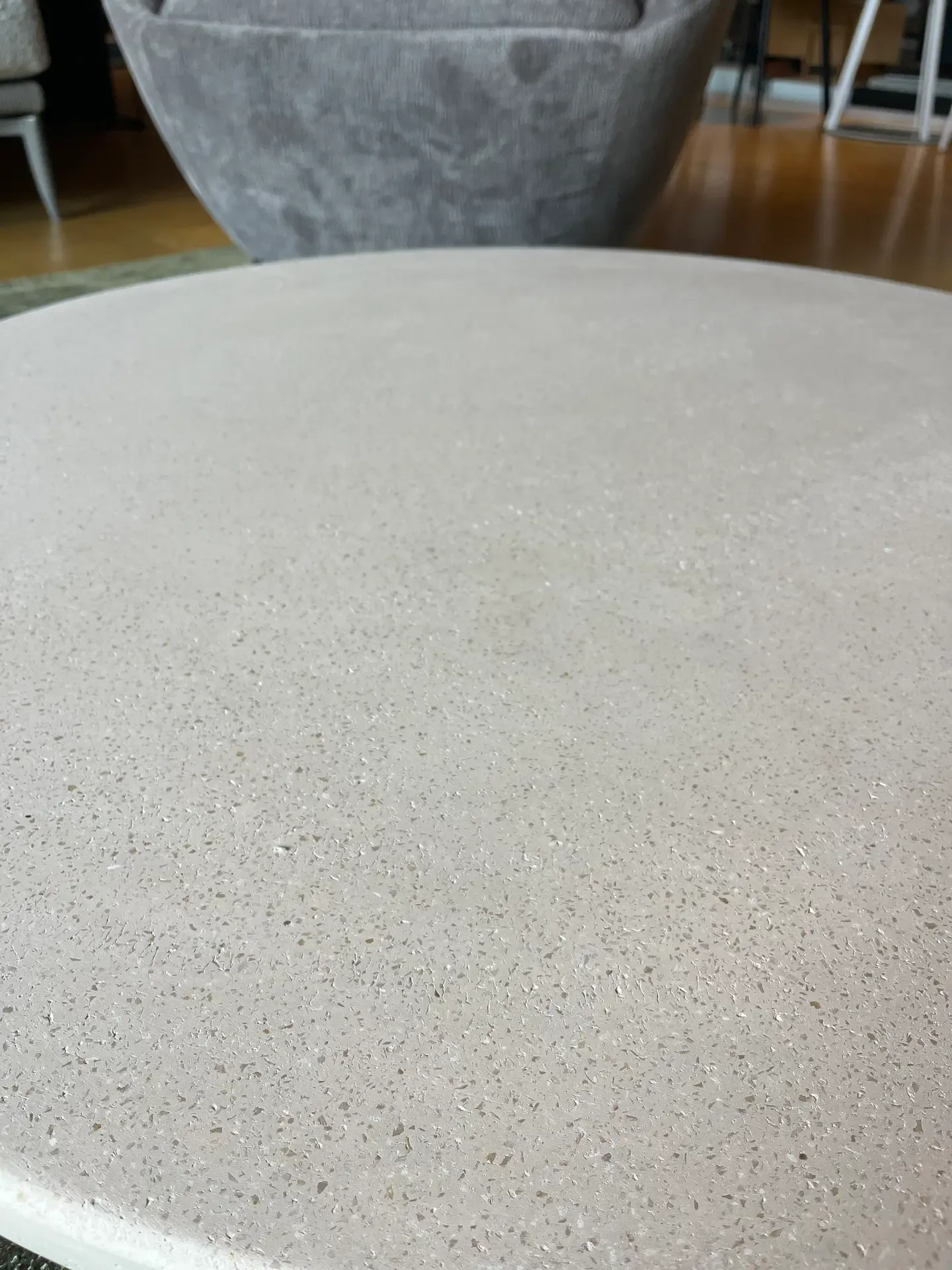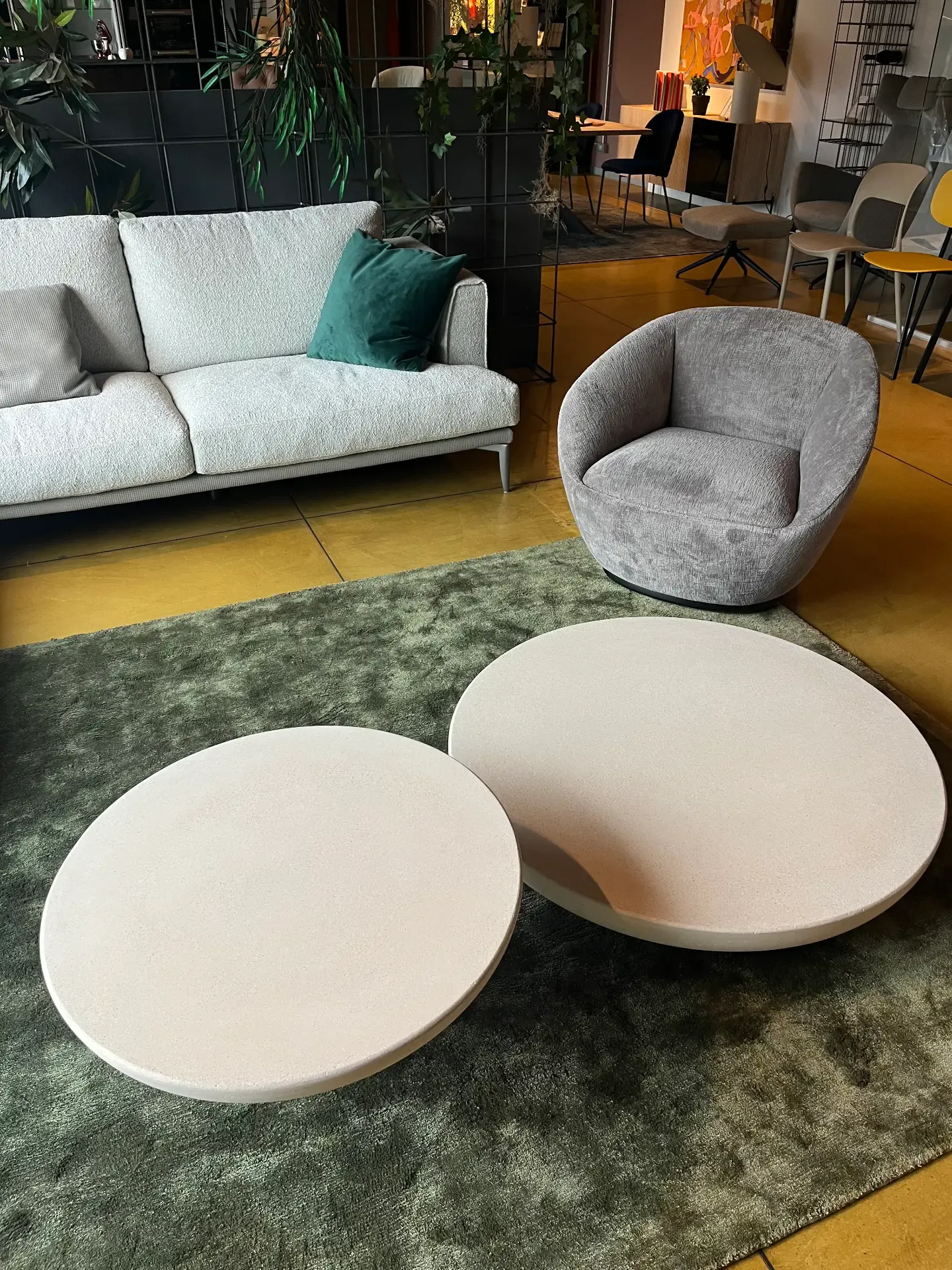 Coppia di tavolini monolitici in cemento con finitura a cera, colore avorio.