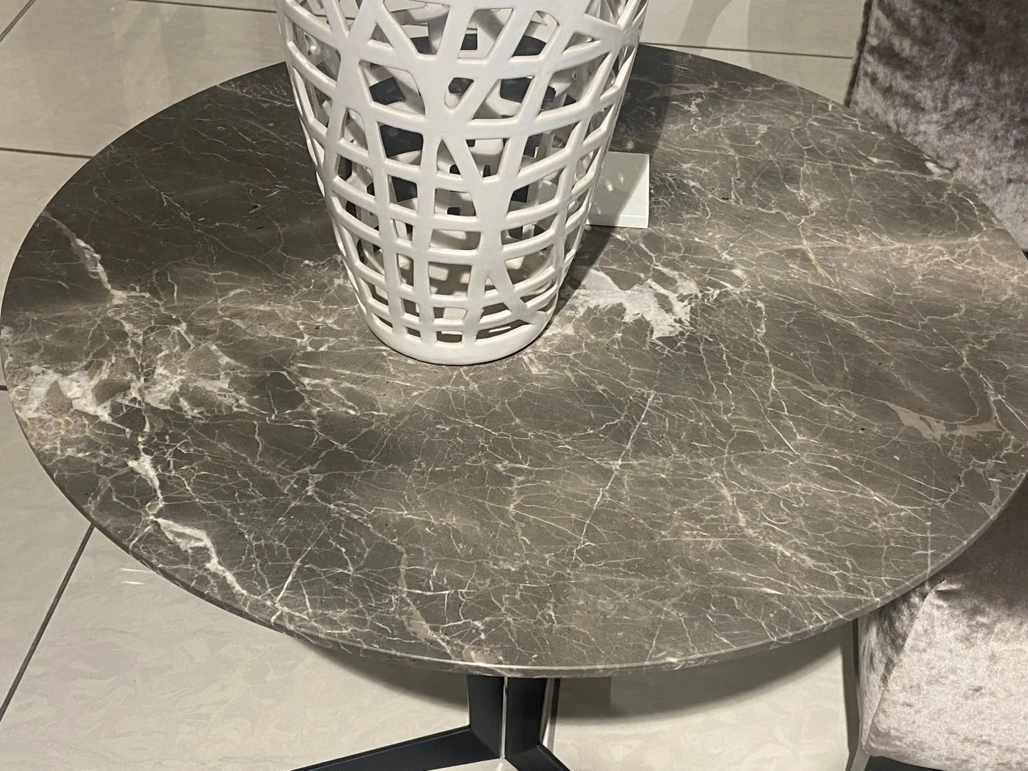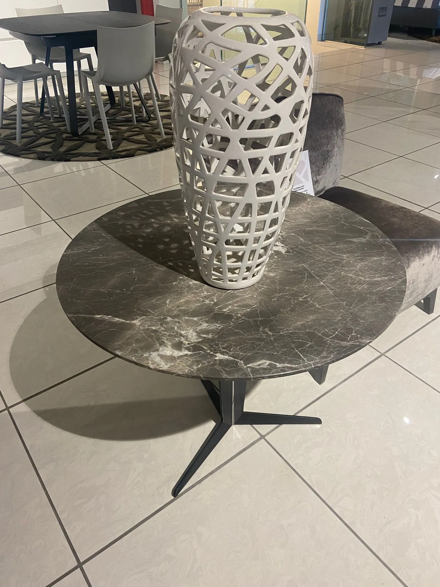 Tavolino Molteni & C. modello Attico disegnato da Nicola Galizia.Misura diametro cm. 80 alto cm. 64,3.Finitura piano in marmo grigio oriente.Base in peltro.