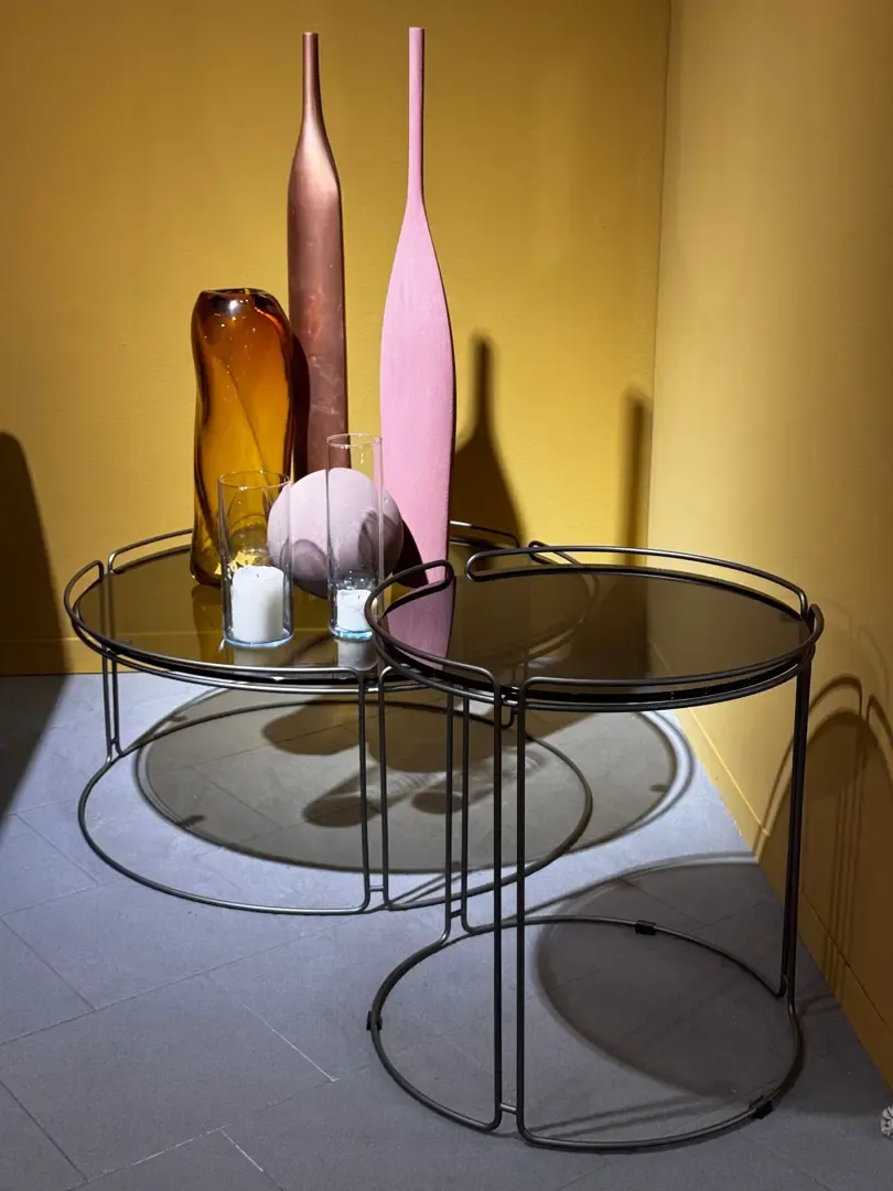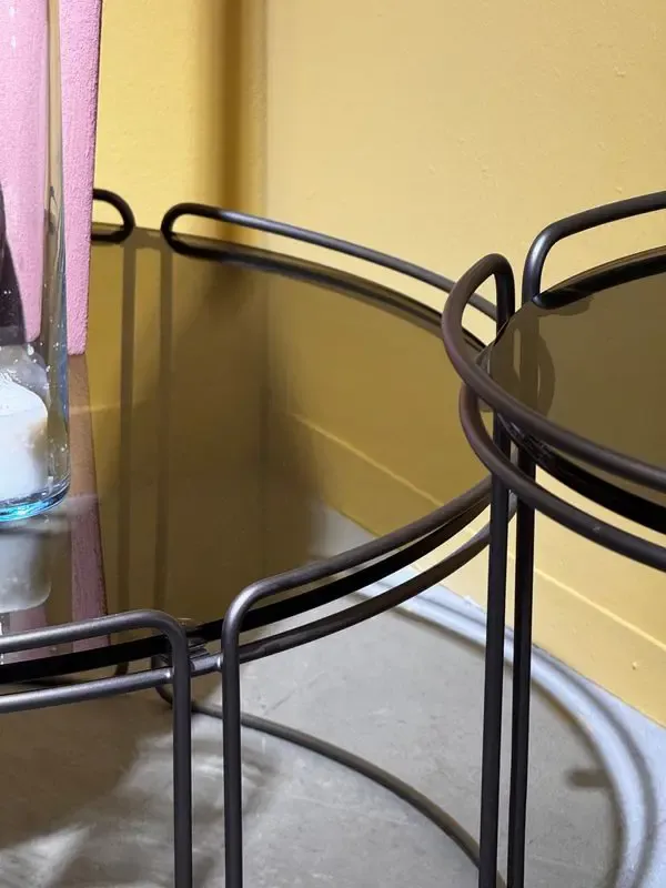 Tavolino mod. Monolith alto, con struttura metallo verniciato personalizzato Light Brown e piano in vetro temperato fumé, fa parte di una coppia ma può essere venduto anche separatamente. Prezzo di 1 tavolino.
