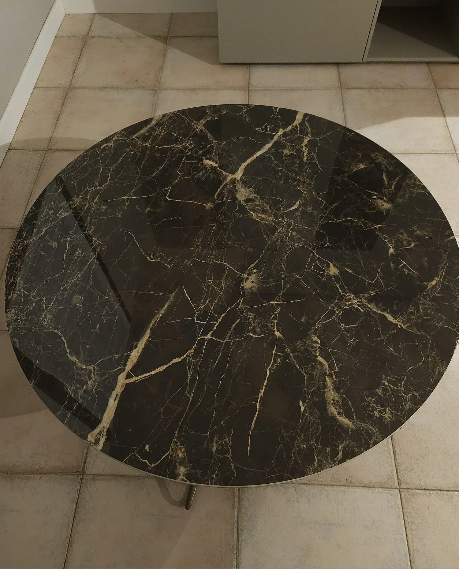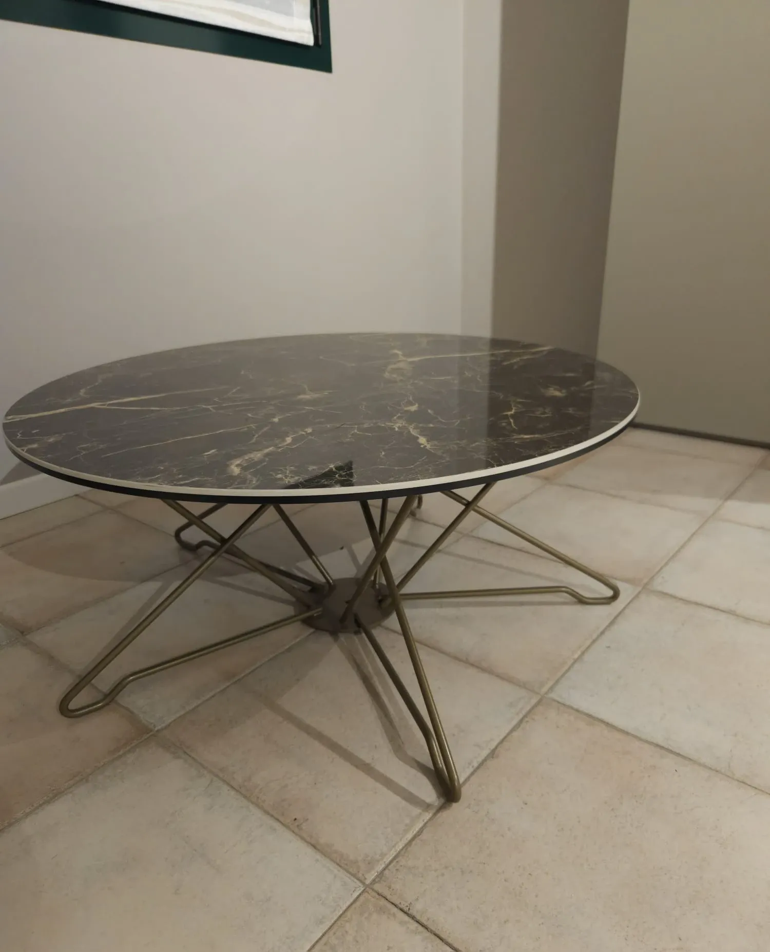 Tavolino da salotto con struttura in metallo verniciato bronzo e piano in gres porcellanato emperador.