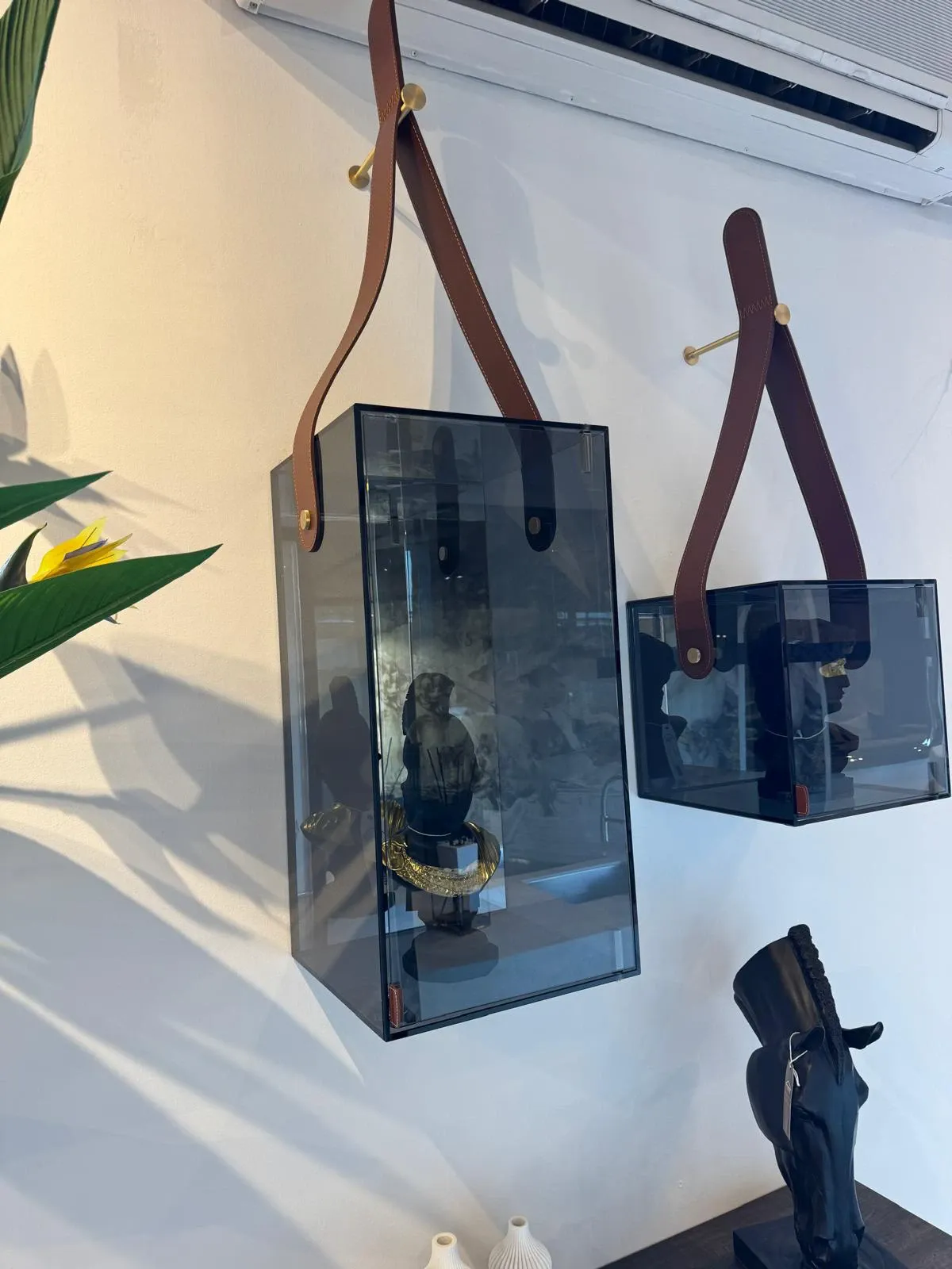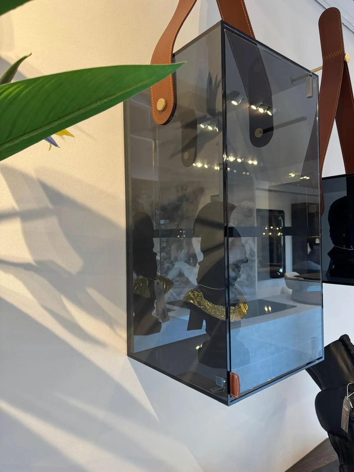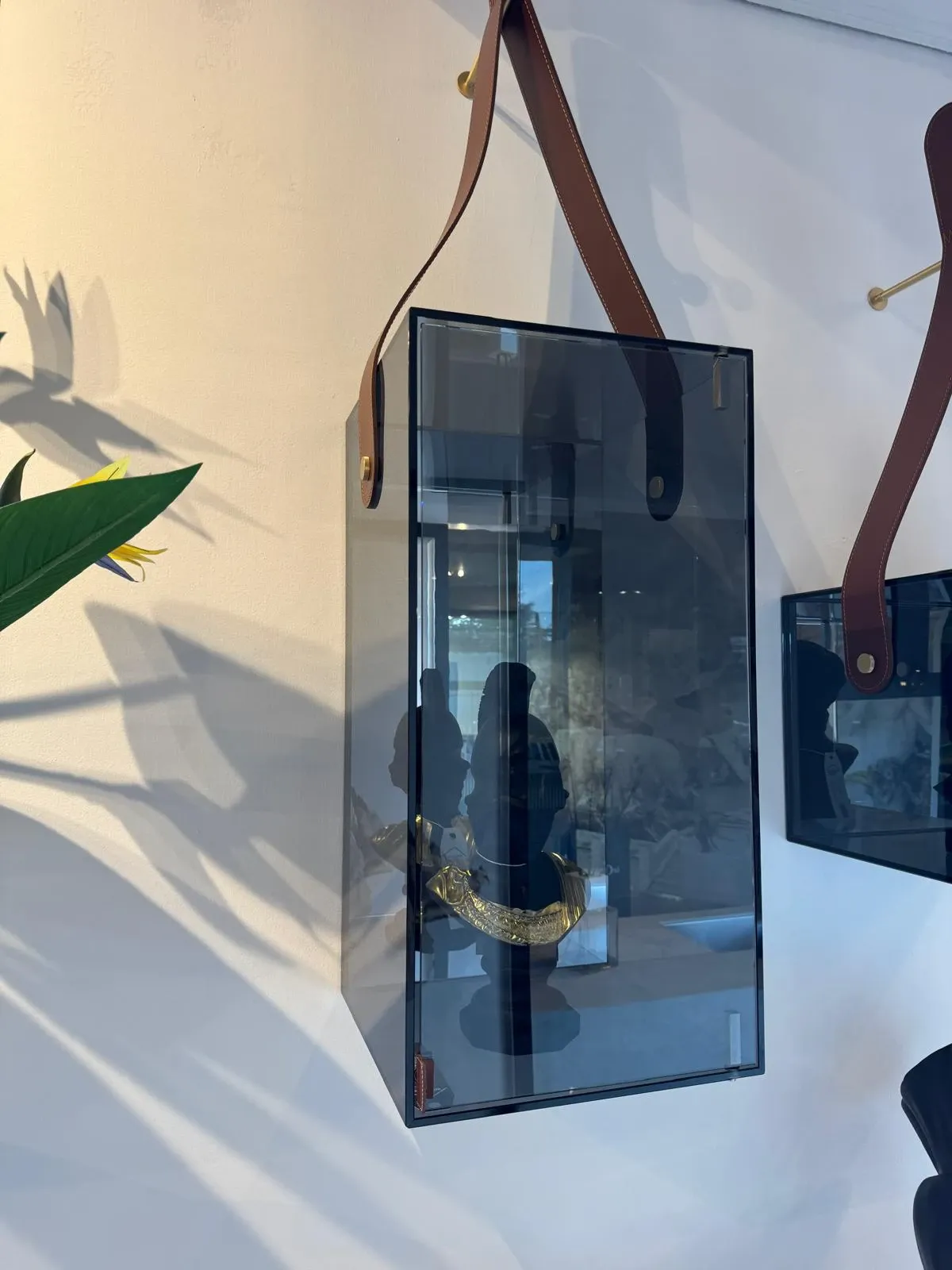 Elegante teca di cristallo, con schienale specchiante e decorate con particolari in vero cuoio pensata per arricchire con un tocco di stile ogni living.