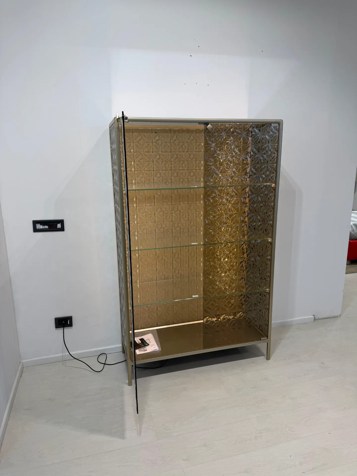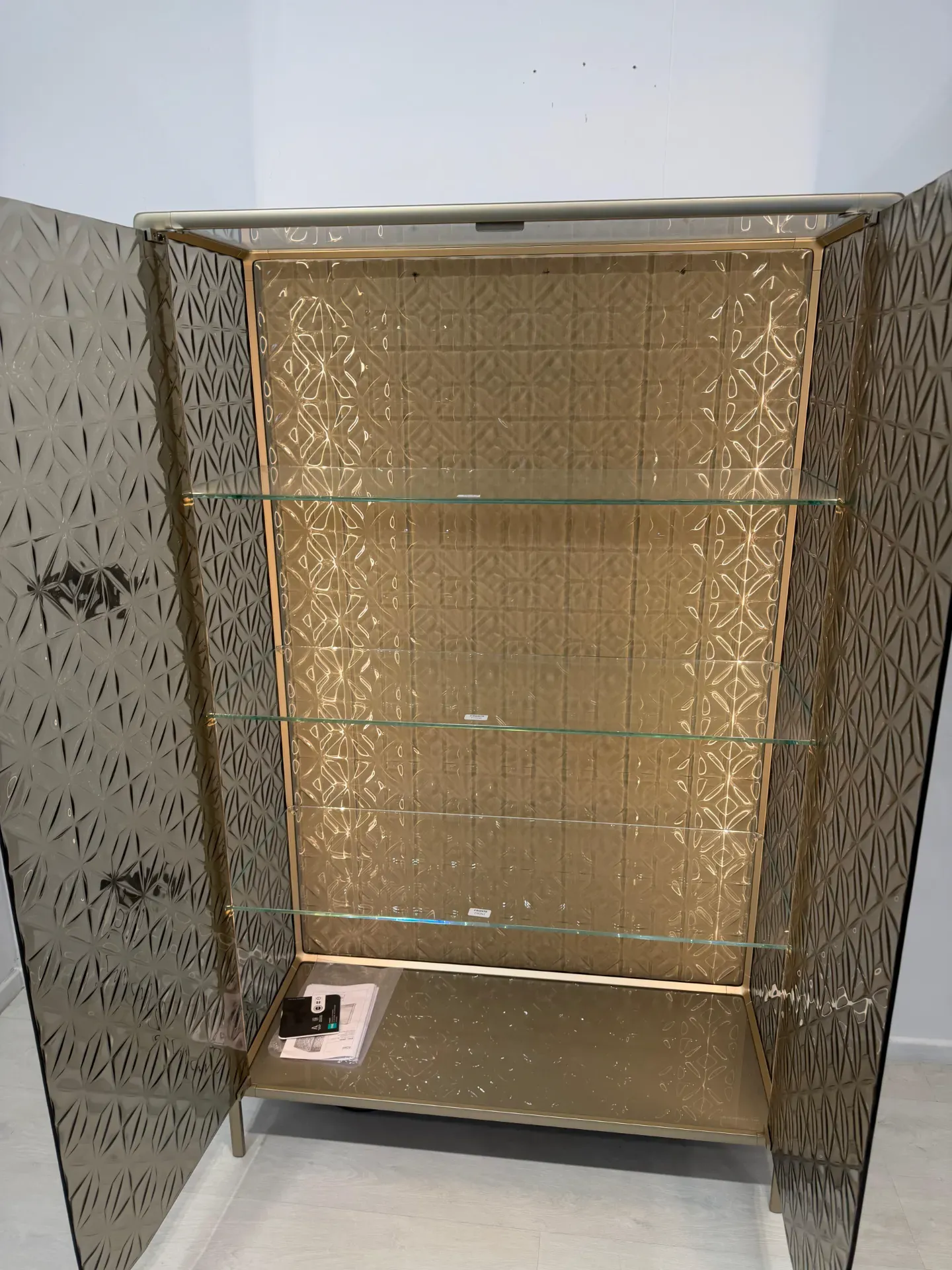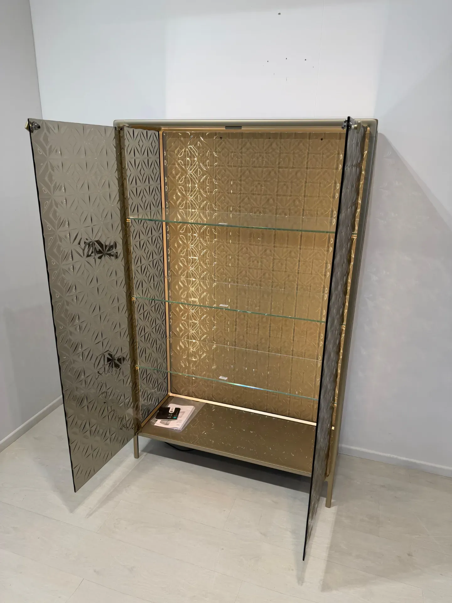 Dettagli: vetrinetta in vetro fuso color bronzo, struttura in alluminio verniciato champagne. Illuminazione led interna, 3 ripiani in vetro