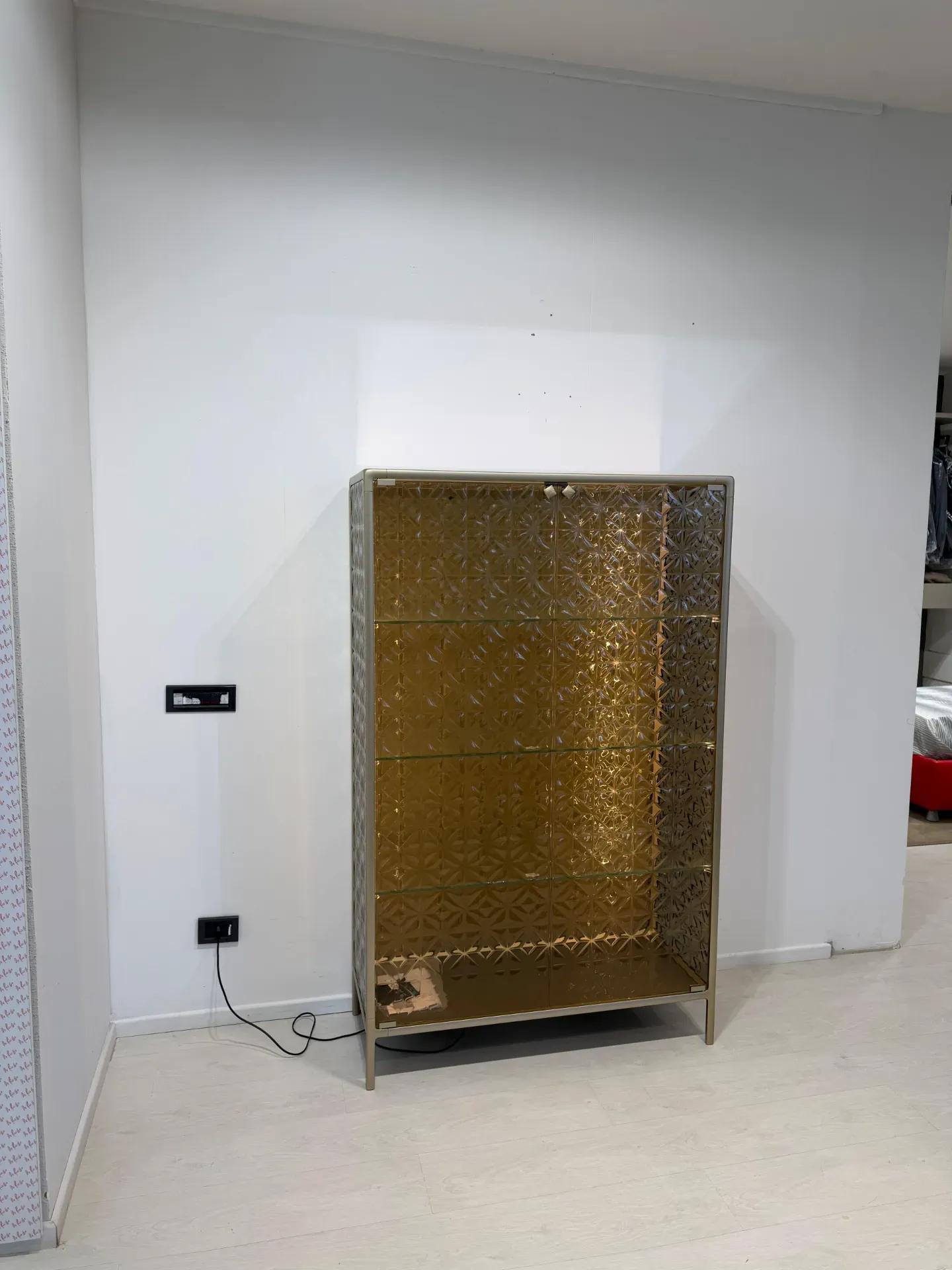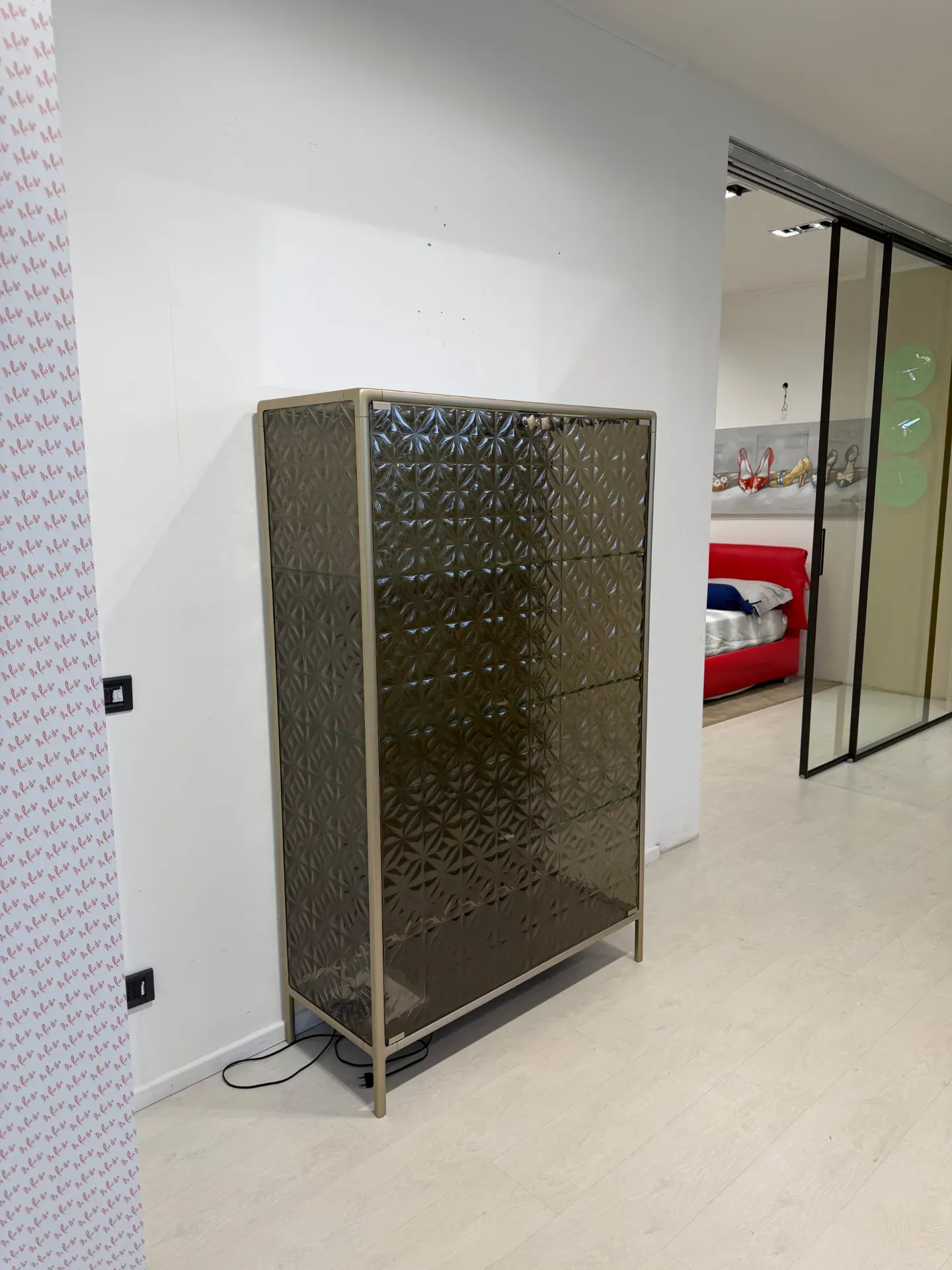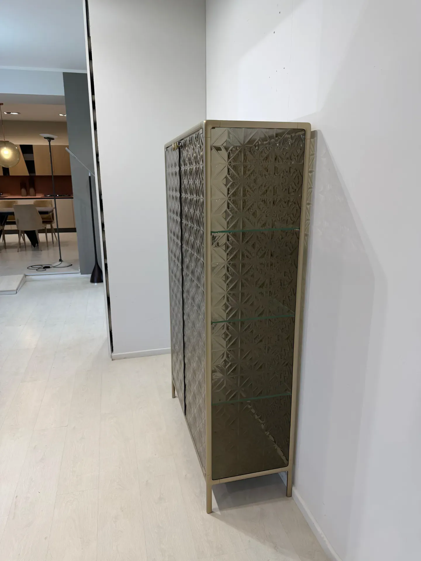Dettagli: vetrinetta in vetro fuso color bronzo, struttura in alluminio verniciato champagne. Illuminazione led interna, 3 ripiani in vetro