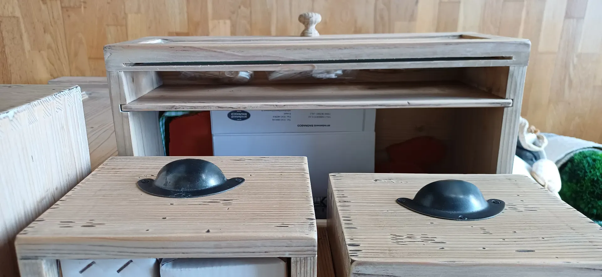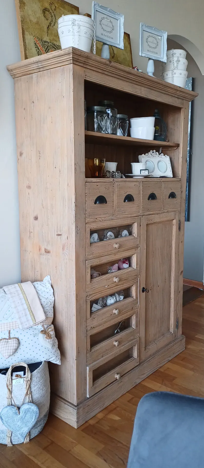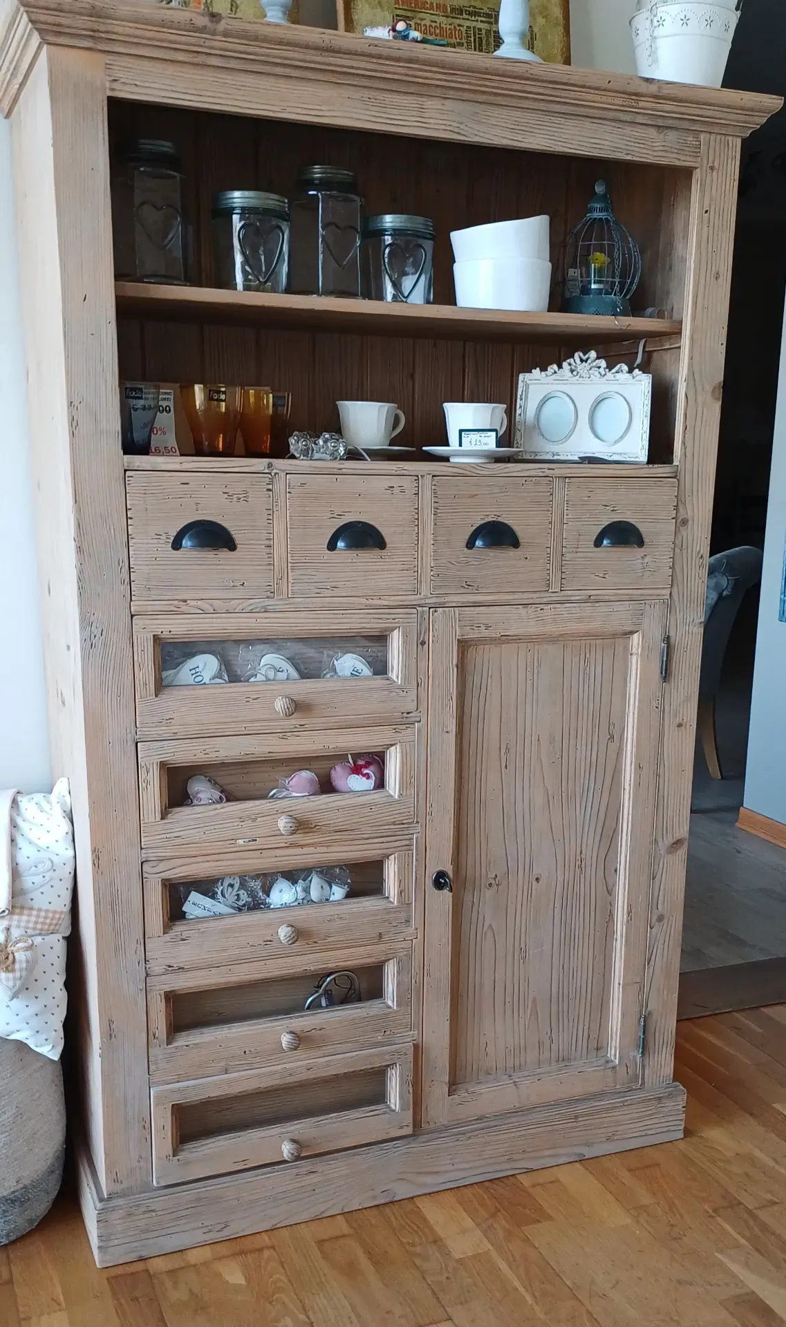 Anta laterale ben rinfinita con chiusura a chiave, ripiano interno e pomoli in legno per apertura dei cassetti.