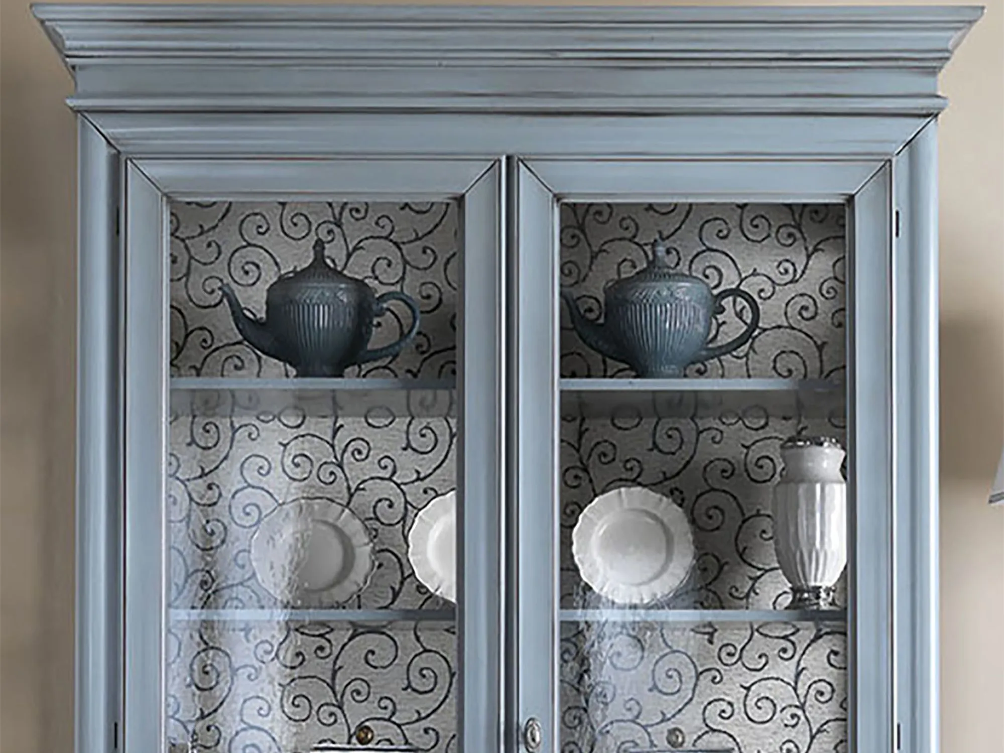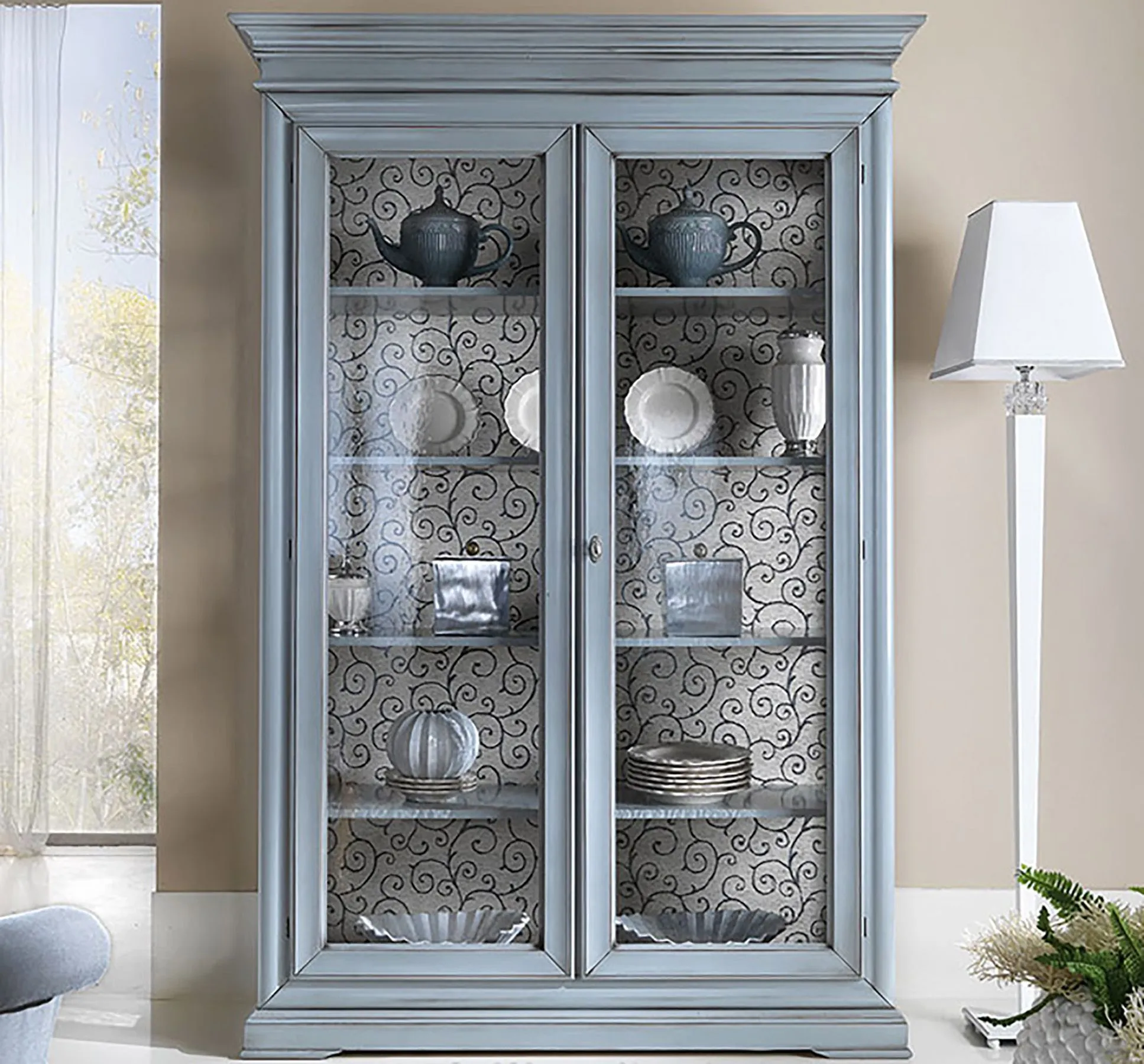 Vetrina Mobilike Amélie modello ML A/6703 con 2 ante con vetro trasparente e 4 ripiani interni. Questo splendido complemento d'arredo, richiama lo stile provenzale e shabby chic. Adatta anche a chi vuole apportare contemporaneitŕ e un tocco di luce ad ambienti in stile classico, in quanto il colore si integra bene anche con arredi in finuture piů scure.